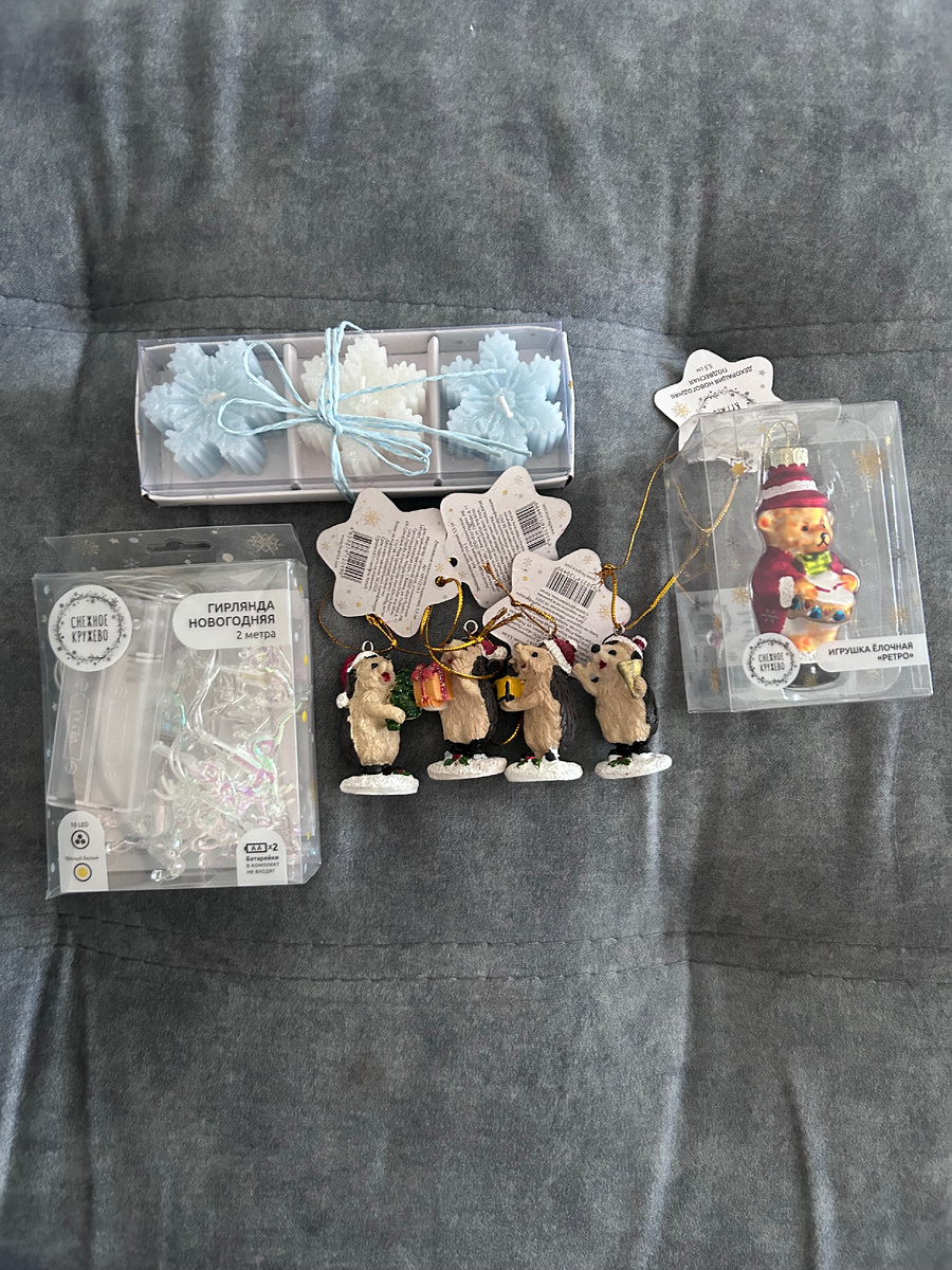 Ох, и люблю я Фикс Прайс за его разнообразие и доступные цены. Мы часто заходим туда с дочкой, чтобы купить бытовые принадлежности, вкусняшки и декор для дома. В этот раз мы прикупили декор к Новому году. Свечи. Мы их с дочкой просто обожаем. Зажигаем вечером, когда ужинаем или пьем чай. Свечи ждём только зимой, в остальное время года они не завораживают. У нас были разные. В этот раз мне захотелось в виде снежинок. Они небольшие и довольно милые. Гирлянду в виде оленей взяли в детскую комнату. Она работают от батареек. Долго искали ей место, решили положить на стол. Ну и игрушки. В магазине очень много разных и красивых, но мы решили взять немного. У нас есть с прошлого года, да и я хочу на следующий год полностью поменять все игрушки и купить искусственную елку. Взяли 4-х ежиков. С елкой, подарком, фонарем и колокольчиком. Но внимательно смотрите, могут быть сколы. Красивые маленькие фигурки. И взяли одну «Ретро» игрушку - Мишку. На данный момент больше ничего не покупали. Но бу