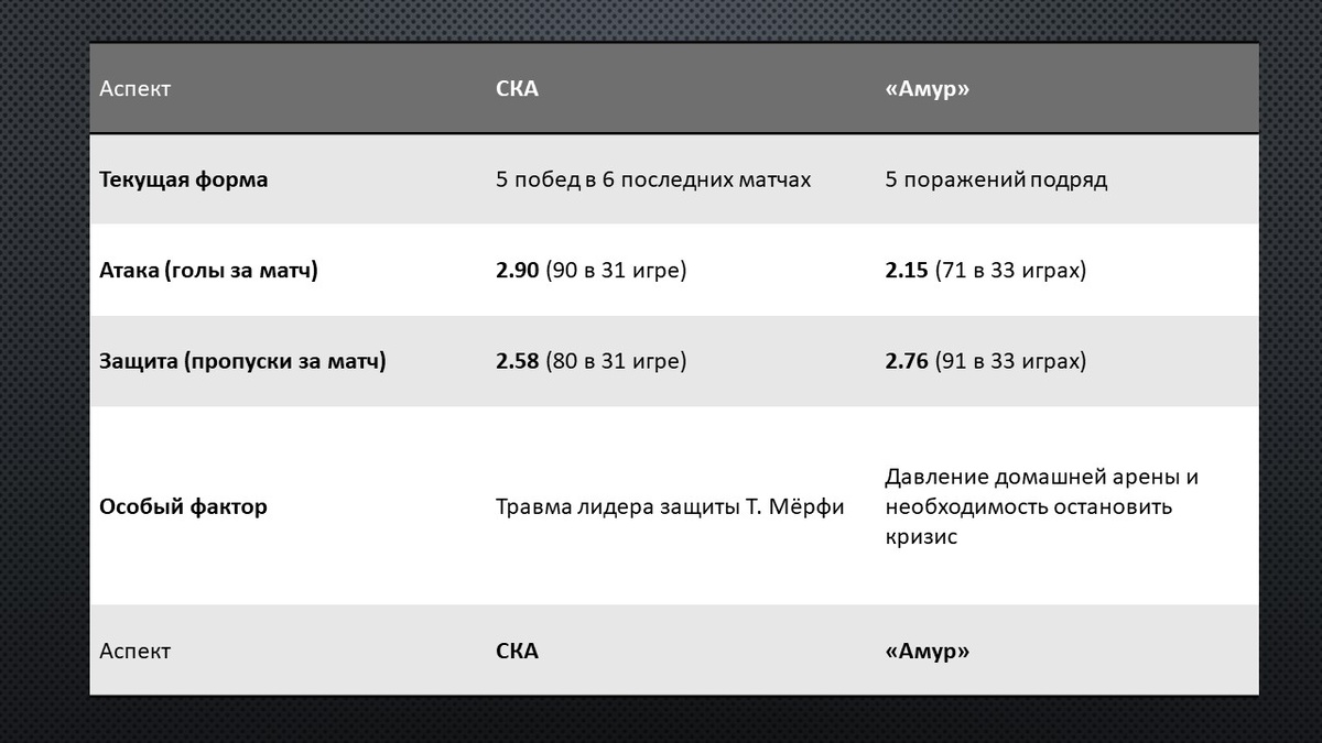 На «Платинум-Арене» в Хабаровске 7 декабря состоится матч, который со стороны статистики выглядит предрешенным. СКА, один из грандов лиги, встречается с «Амуром», который переживает глубокий кризис. Но главный вопрос этого противостояния в другом: хватит ли у «тигров» духа и сил, чтобы в родных стенах переломить устрашающую статистику и дать бой мощному сопернику, или армейская машина из Петербурга безжалостно переедет хозяев? 📊 Анализ форм команд: кризис против уверенности Команды подходят к матчу в диаметрально противоположных состояниях. * СКА (Санкт-Петербург): Армейцы демонстрируют уверенную игру и находятся в отличной форме. В шести последних матчах команда одержала пять побед. СКА отличается мощной атакой, забросив в текущем сезоне 90 шайб в 31 матче, и уверенно чувствует себя в гостях, выиграв четыре из пяти последних выездных матчей. Однако недавно команда потеряла ключевого защитника **Тревора Мёрфи**, который получил серьезную травму в матче с «Адмиралом». Это слабое место