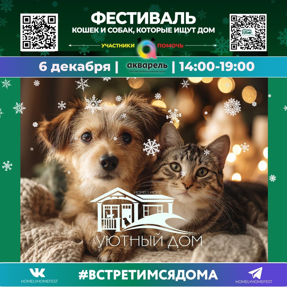 В ТРЦ Акварель Пушкино 6 декабря пройдет фестиваль кошек и собак которые ищут дом. Внутри ТРЦ потрясающая Новогодняя фотозона с огромной нарядной елкой! Гости, друзья, подарки, мандарины и хорошее настроение - все атрибуты прекрасного, самого домашнего праздника, и чудесные питомцы - всё это ждет и взрослых, и детей!