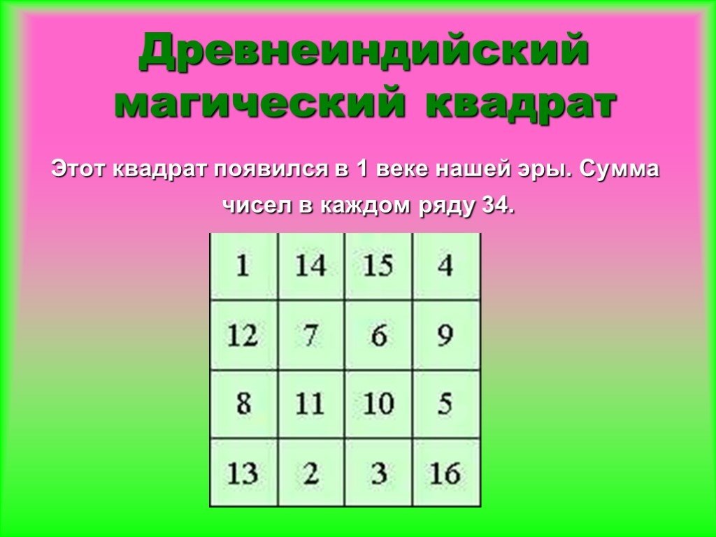 Научники специально ПОДБИРАЛИ числа для составления своих магических квадратов. Я же просто беру ВСЕ цифры и числа десятичной системы счисления ПОДРЯД. 1) Вот стандартный расклад цифр на клавиатуре ТЕЛЕФОНА : 1.2.3. 4.5.6. 7.8.9. Рассекаем этот квадрат линиями по "розе ветров" и СКЛАДЫВАЕМ числа (ПОСЛЕДОВАТЕЛЬНЫЕ цифры десятичной системы счисления) по этим ПРЯМЫМ линиям : 1 + 5 + 9 = 15 2 + 5 + 8 = 15 3 + 5 + 7 = 15 4 + 5 + 6 = 15 15 - это число так называемых МAГИЧЕСКИХ КВАДРАТОВ ! 15 - это первое число последовательности A006003 Складываем ВСЕ числа, которые есть в этом квадрате : 1 + 2 + 3 + 4 + 5 + 6 + 7 + 8 + 9 = 45 Это число делим на количество чисел В СТОРОНЕ магического квадрата. То есть НА ТРИ ! 45 : 3 = 15 MИЛЛИAРДЫ И.Д.И.O.T.О.B тyпо смотрят и жмyт на кнопки клавиатуры своих телефонов - но мaгичeский квадрат РАЗГЛЯДЕЛ ТОЛЬКО Я !!! ------------------------------- 2) Следующий мaгичeский квадрат ПОСЛЕДОВАТЕЛЬНЫХ чисел со стороной в ЧЕТЫРЕ числа : .1....2...3...4. .5....6...7
