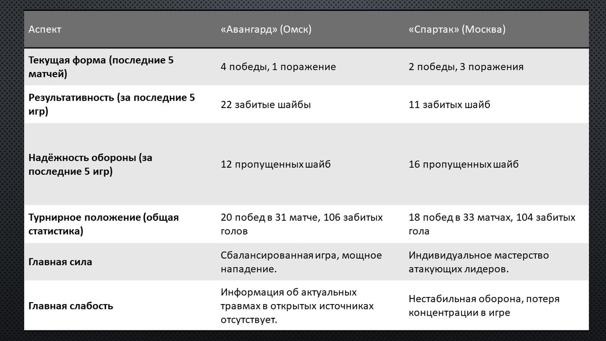 На ледовой арене «G-Drive Арена» в Омске 7 декабря в 14:00 по московскому времени развернётся одно из ключевых противостояний игрового дня КХЛ. На вершину готовится взобраться уверенный в себе «Авангард», находящийся в прекрасной форме. На его пути встаёт московский «Спартак» — коллектив с громким именем, но переживающий не лучшие времена. Главный вопрос матча: найдёт ли «красно-белый» аргументы, чтобы остановить летящий вперёд «Авангард», или омичи продолжат свою победную поступь? Анализ команд: Контраст форм Команды подходят к матчу в совершенно разном состоянии, что наглядно демонстрирует их недавняя статистика. «Авангард» демонстрирует яркий, результативный и при этом достаточно надёжный хоккей. Команда не только много забивает, но и уверенно контролирует игру, что делает её грозным соперником на домашнем льду. «Спартак», напротив, выглядит нестабильно. Несмотря на наличие в составе ярких исполнителей, команда допускает слишком много ошибок в защите и порой не может навязать свою