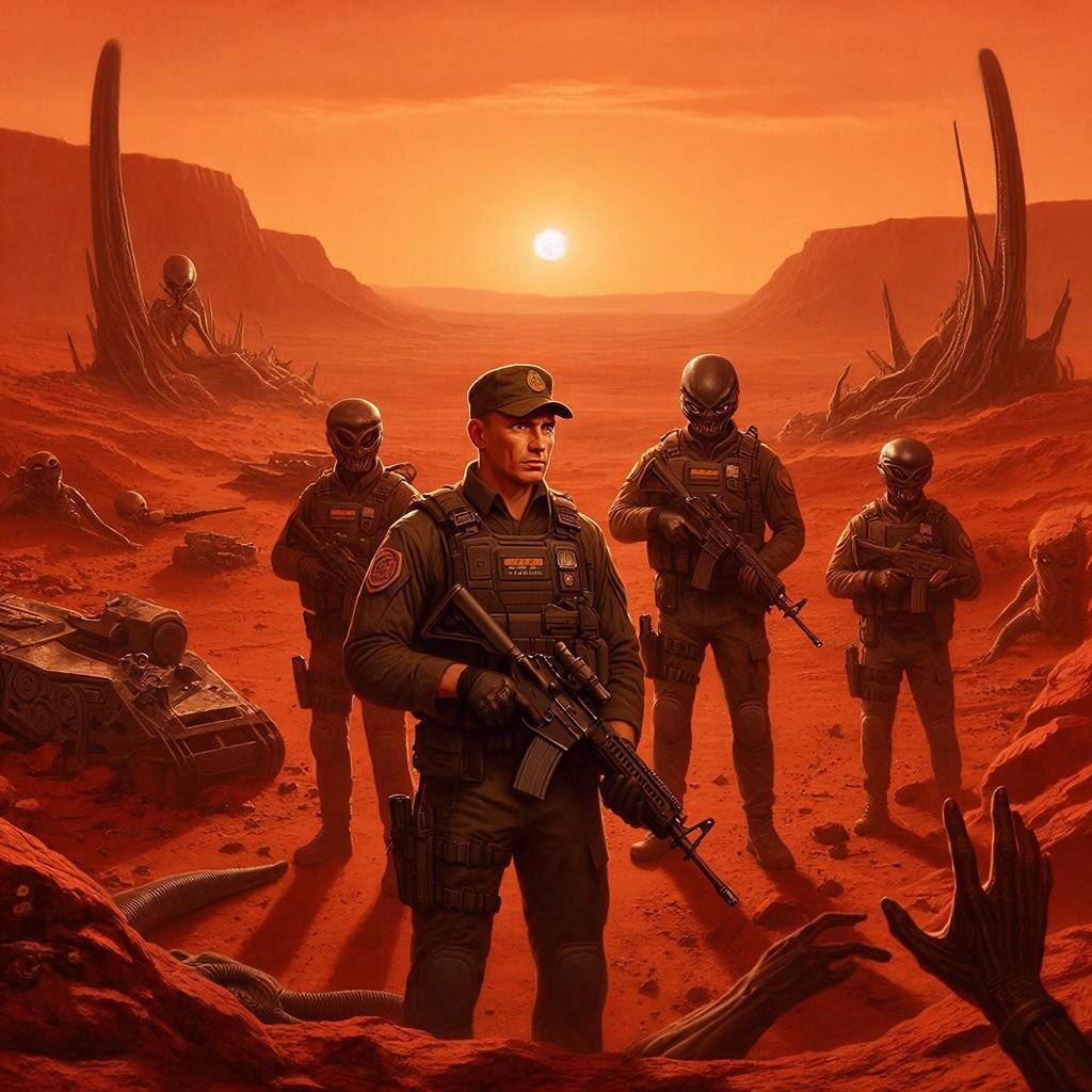 Голос радиста Волкова прорезал тишину красного марсианского неба. Группа русских бойцов замерла посреди незнакомого пейзажа. Перед ними простирались бескрайние пустыни планеты, тускло подсвечиваемые багровым солнцем.