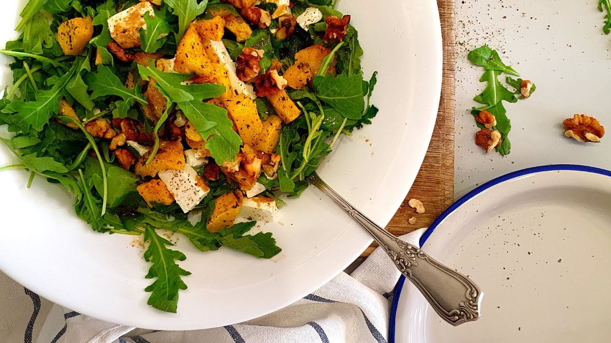 Салат в честь символа удачи! Сладкая запеченная тыква, пикантный козий сыр и горьковатая руккола создают идеальный баланс. Это праздничное, очень фотогеничное и небанальное блюдо.