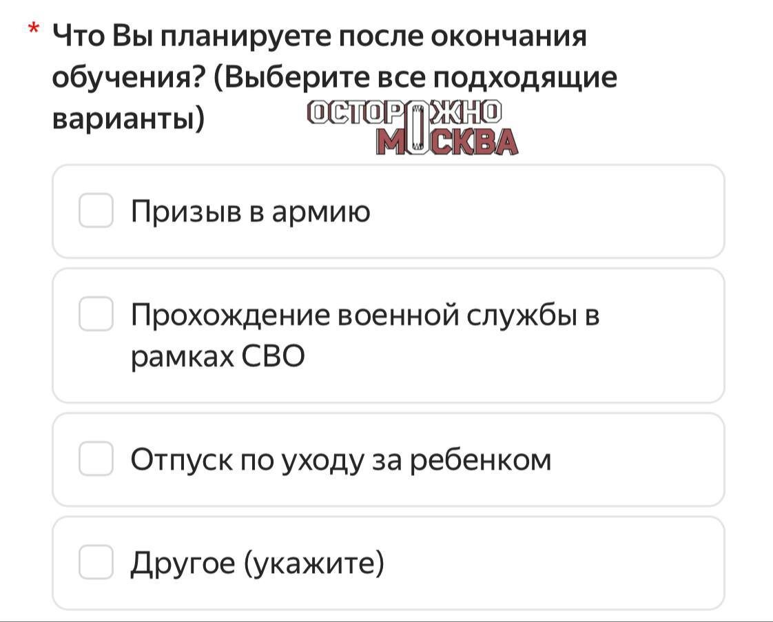 Студентов РУДН обязали пройти опрос о планах после выпуска: в вариантах ответов указаны армия, СВО и рождение ребенка. Сотрудник кафедры дал QR-код на форму, результаты требуют подтверждать скриншотом. Опрос проходят только российские студенты, охват должен быть 100%. Подписаться на Подмосковье сегодня
