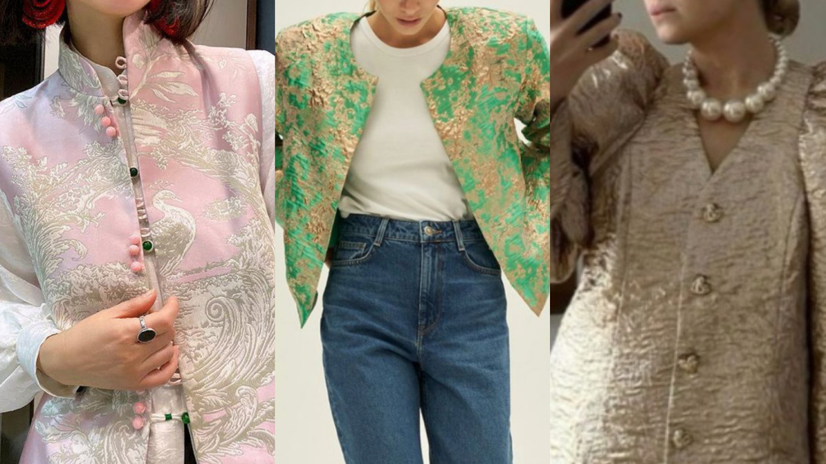 Что искать в 2025-м? Современный жаккардовый жакет - не старомодный пиджак бабушки. Это структурированная вещь, часто с силуэтом, напоминающим рыцарский дублет, с подплечниками или контрастной подкладкой, которая мелькает при движении, как интригующая деталь.