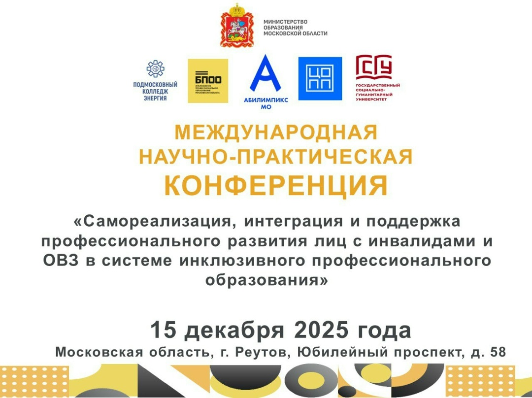 Уважаемые коллеги! Приглашаем на Международную научно-практическую конференцию «Самореализация, интеграция и поддержка профессионального развития лиц с инвалидностью и ОВЗ в системе инклюзивного профессионального образования»! Организаторы: Центр инклюзивного профессионального образования БПОО ГАПОУ МО «ПК «Энергия».