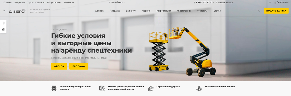 О клиенте Димерс – компания по продаже и аренде спецтехники. У клиента был старый сайт (посадочная). Запрос клиента заключался в том, чтобы получить новый, современный, красивый и удобный сайт, на котором была бы представлена полная информация о выполняемых услугах по аренде спецтехники, а так же был бы каталог техники к продаже. Кроме того, для клиента важно было, чтобы на сайте была возможность удобно и быстро оформить заявку на аренду или связаться по вопросу покупки техники. Перед нами стояла задача не просто разработать сайт, а создать стильный и рабочий инструмент, представляющий компанию Димерс в онлайн-пространстве. Решение Для достижения поставленных целей нами были выполнены следующие задачи: - Установка сайта на готовом решении; - Настройка структуры сайта; - Настройка каталога, составление инструкций к заполнению на каталога; - Настройка карточек товаров; - Доработка вывода основных характеристик в список и настройка фильтра; - Настройка региональности на поддоменах; - Изм