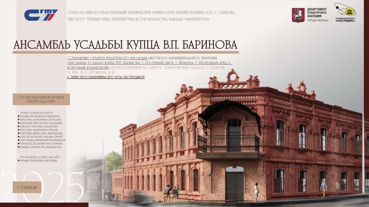 Под научным руководством доцента кафедры «Архитектура» Института УРБАС Татьяны Негуляевой политеховцы разработали концепцию по сохранению объекта культурного наследия муниципального значения «Ансамбль усадьбы купца В.П. Баринова», который расположен по адресу: г. Саратов, ул. имени И.С. Кутякова, д. 12. Целью проекта является адаптация ансамбля под современный гастродвор.