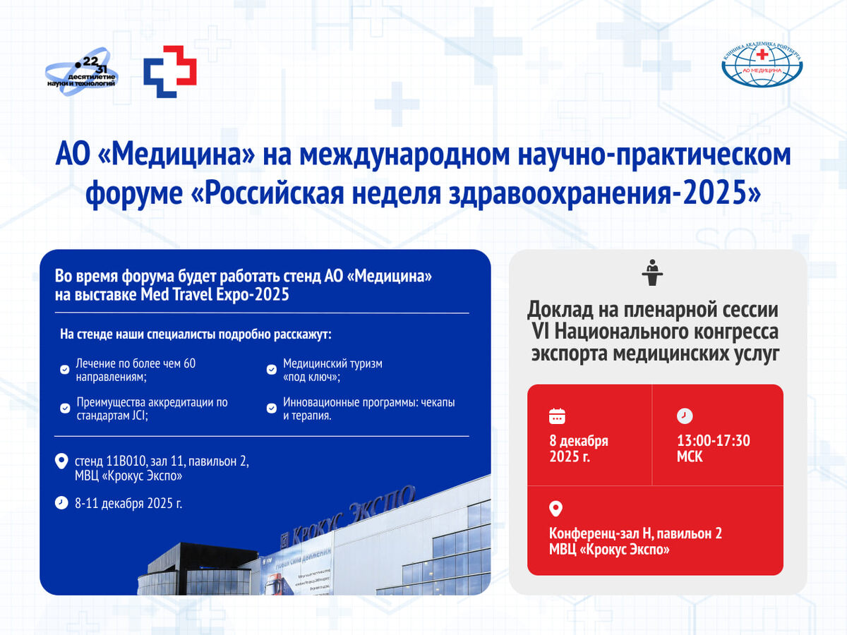 В декабре этого года наша клиника примет участие в главном отраслевом событии - Международном форуме «Российская неделя здравоохранения 2025». Это отличная возможность для нас встретиться с коллегами, партнерами и рассказать о своем опыте. 8 декабря 2025 года с 13:00 до 17:30 в рамках форума состоится VI Национальный конгресс экспорта медицинских услуг. В ходе пленарной сессии, клиника поделится опытом из области развития медицинского туризма, внедрения российских и международных стандартов качества и построения эффективной системы медицинского сервиса, востребованной как у российских, так и у зарубежных пациентов. Будем обсуждать с руководителями ведущих медцентров и представителями власти стратегические направления развития экспорта российских медицинских услуг. А с 8 по 11 декабря приглашаем всех гостей форума к нам на стенд! Вы найдете нас на специализированной выставке медицинского туризма Med Travel Expo 2025. 📍 МВЦ «Крокус Экспо», павильон 2, зал 11, стенд 11В010. Приходите, ч