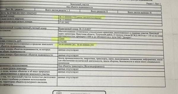 Название: Сведениями о фактическом состоянии объекта недвижимости организатор торгов не располагает Канал: Госземля Иркутская область Область: обл Иркутская Район: м.р-н Тулунский Иркутская обл. Населенный пункт: Тулунский р-н, от полосы отвода ВСЖД (4818 км + 150 м) на север протяженностью примерно 11000 м до обгонного жд пути ОАО «Долерит». Локация: Смотреть на карте ВРИ: Железнодорожный транспорт Кадастровый номер: 38:15:000000:57 Кадастровая стоимость: - Вид сделки: Продажа Площадь: 52000 м² Начальная цена: 7020150.00 руб. Дата завершения: 12.12.2025 Подробнее: ГИС ТОРГИ #госземля #земляотгосударства #земля #земельныйучасток #земельныеторги #торги #аукцион #продажаземли #продажа #иркутскаяобласть