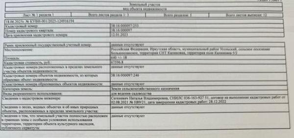 Название: Сведениями о фактическом состоянии объекта недвижимости, об обременении третьих лиц в виде сохранения права пользования объектами организатор торгов не располагает. Канал: Госземля Иркутская область Область: обл Иркутская Район: м.р-н Усольский Населенный пункт: с.п. Большееланское, тер. СНТ Калиновка, тер поле Калиновка 5/2 Локация: Смотреть на карте ВРИ: Ведение садоводства Кадастровый номер: 38:16:000097:253 Кадастровая стоимость: - Вид сделки: Продажа Площадь: 640 м² Начальная цена: 150000.00 руб. Дата завершения: 19.12.2025 Подробнее: ГИС ТОРГИ #госземля #земляотгосударства #земля #земельныйучасток #земельныеторги #торги #аукцион #продажаземли #продажа #иркутскаяобласть