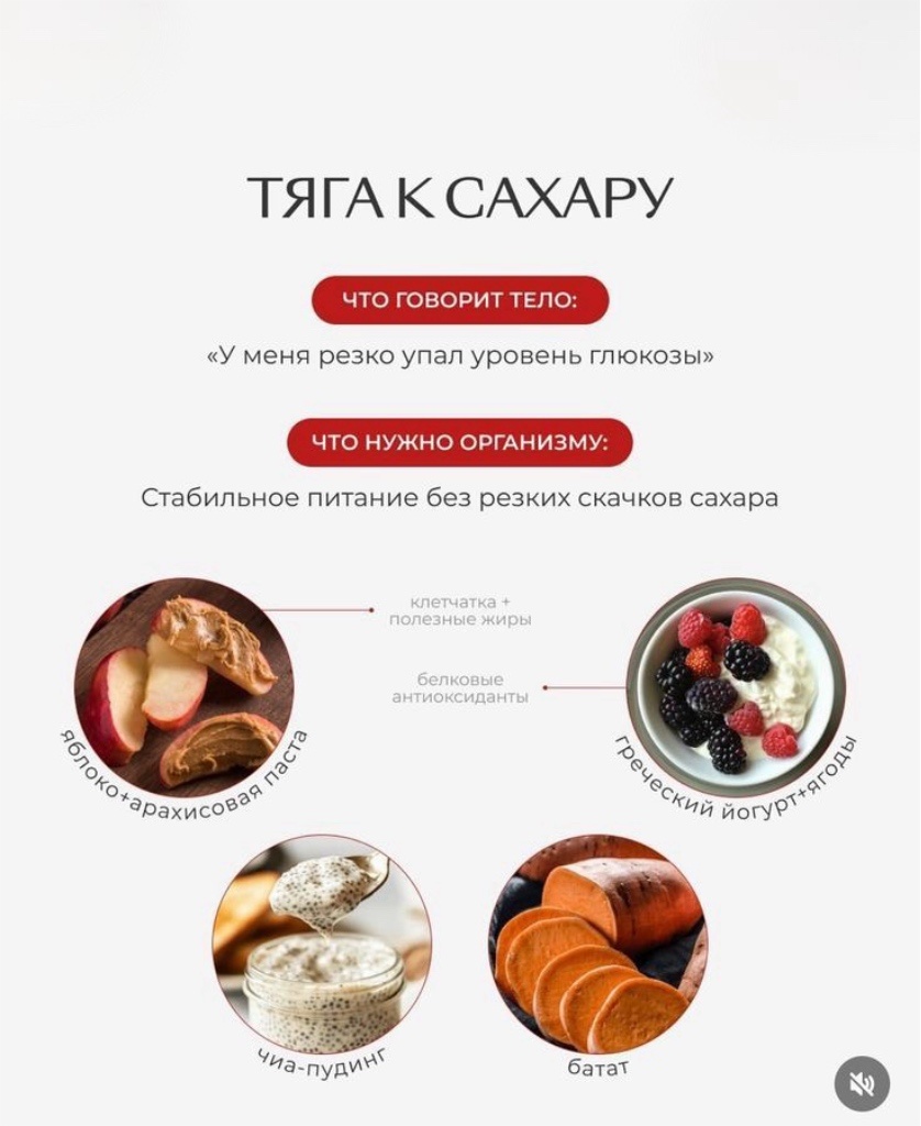 Наши пищевые желания — это язык тела. Часто за ними стоят не слабость воли, а реальные дефициты и физиологические потребности. Вот что могут означать разные виды тяги. 🍫 Тяга к сладкому Возможные причины: — Низкий уровень энергии, скачки глюкозы — Недостаток сна — Стресс и повышенный кортизол — Дефицит магния Что может помочь: Больше продуктов с магнием (какао, орехи, семечки, шпинат), полноценный сон, приём пищи с белком и клетчаткой. 🍞 Тяга к углеводам (хлеб, выпечка, паста) Возможные причины: — Недостаток сложных углеводов в рационе — Хроническая усталость — Недостаток триптофана — Низкий уровень серотонина Что может помочь: Добавить цельные крупы, бобы, киноа, больше белка. Продукты с триптофаном (индейка, яйца, творог). 🥩 Тяга к красному мясу Возможные причины: — Дефицит железа — Недостаток витамина B12 — Нехватка белка Что может помочь: Включить источники железа (бобовые, зелень, печень), B12 (рыба, яйца), качественный белок. 🍫 Тяга к шоколаду Это отдельная и