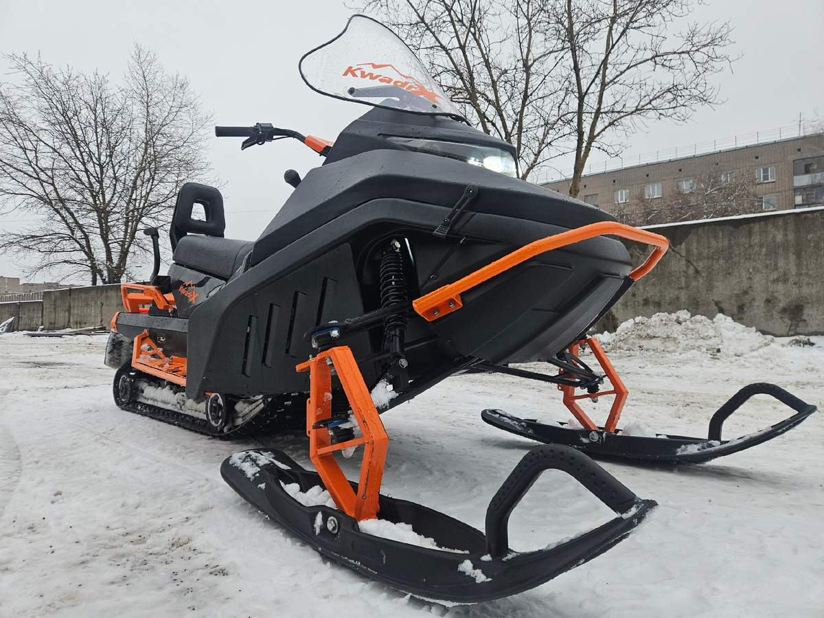 Главный враг снегохода в глубоком снегу — это погружение и буксовка. KwadrX оснащается широкой гусеницей размером 500×3333 мм, которая создаёт минимальное удельное давление на снег, обеспечивая отличную «плавучесть». В паре с ней работает продуманная подвеска: спереди — независимая двухрычажная, сзади — многорычажная. Такая конструкция обеспечивает не только высокую проходимость, но и сбалансированную управляемость, устойчивость на склонах и плавность хода, что критически важно для утомительных многочасовых маршрутов.