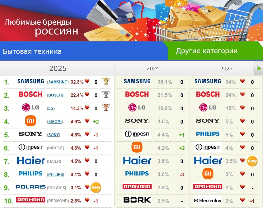 Исследовательская компания OMI составила рейтинг популярных брендов бытовой техники среди россиян За последние три года рейтинг практически не изменился: лидеры остались прежними. Первое место традиционно заняла южнокорейская Samsung с долей в рейтинге 32,3%. Как показало исследование, большинство граждан положительно относятся к этой компании. Samsung лидирует не только в сегменте бытовой техники и электроники, но и на всём российском рынке. Затем до сих пор идут ушедшие из России бренды Bosch и LG. Xiaomi продолжает укреплять свои позиции, приближаясь к лидерам рынка с каждым годом. Об исследовании «Любимые бренды россиян» Исследование ежегодное, проводится с 2008 года. В ходе каждой волны методом онлайн-опроса опрашивают 1500 человек. Выборка квотная стратифицированная, респондентов выбирают случайным образом из access панели OMI из числа людей в возрасте 18 – 55 лет, проживающих в городах с населением свыше миллиона человек. 📱 Новости рынка БТиЭ | Забустить