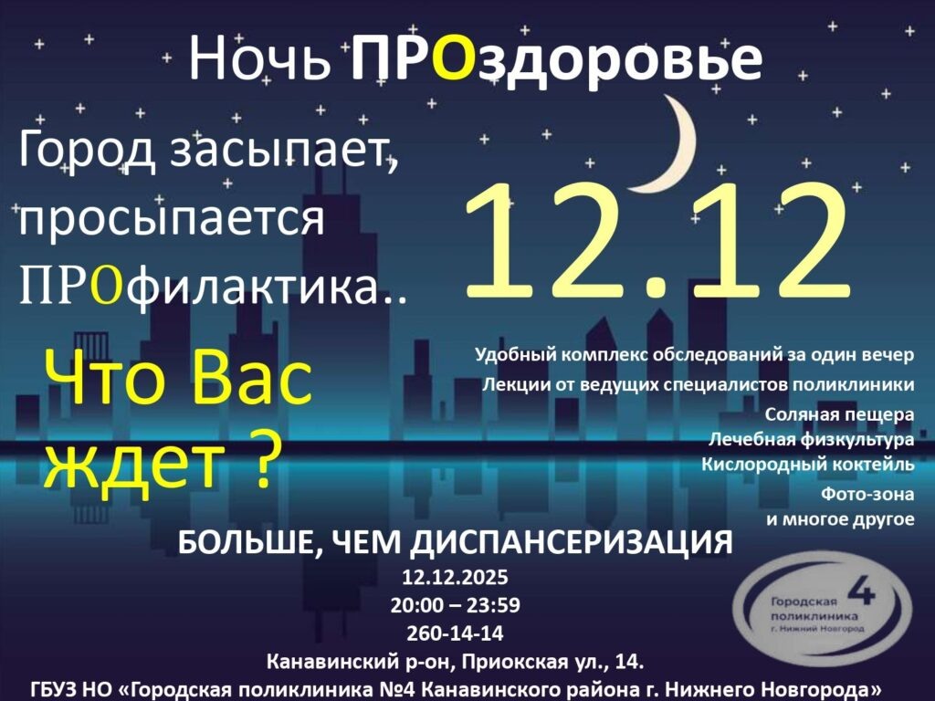 Жители Нижнего Новгорода смогут пройти диспансеризацию и профосмотры в рамках акции «Ночь ПРОздоровье». Об этом рассказали в пресс-службе регионального правительства. Ночная диспансеризация будет организована для пациентов городской поликлиники №4. Нижегородцы, которые не могут отпроситься с работы, смогут проверить здоровье в вечернее время. 12 декабря с 20.00 до 23.59 двери медицинского учреждения будут для них открыты. Пациентам поликлиники №4 предлагается сдать базовые анализы, сделать кардиограмму и флюорографию, а также пройти другие обследования: при наличии показаний терапевт может назначить консультации узких специалистов и УЗИ. Для прохождения осмотров необходимо взять с собой паспорт, полис ОМС и СНИЛС. Напомним, нижегородскую консерваторию могут привлечь для проведения ночной диспансеризации.
