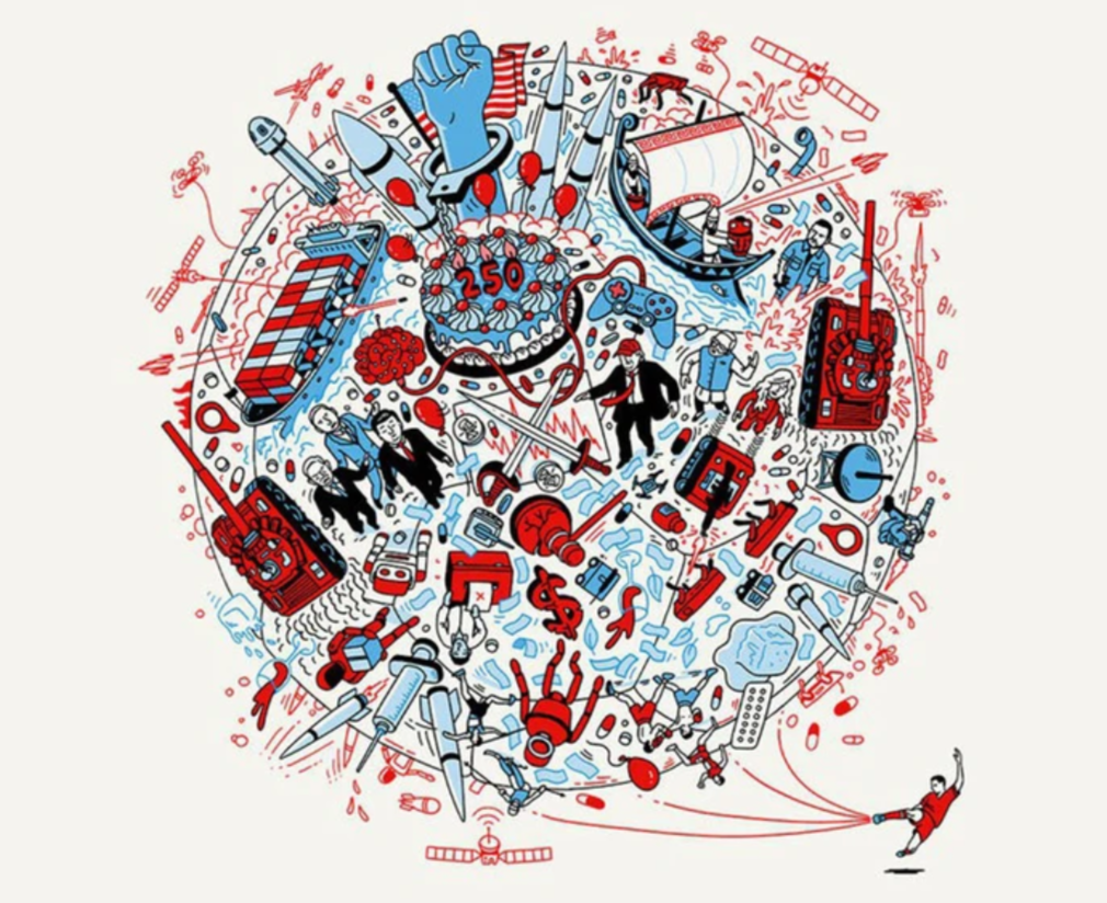 Независимость независимостью, а наручник на руке продолжает быть закрытым. Празднование 250-летия независимости Америки придётся на лето 2026 года. Планируется большой праздник, так как на рисунке мы видим большой торт. Позади торта рука с сжатым кулаком в закрытом наручнике, три ракеты, ясно, что не космические, и всё это на фоне американского флага. Из всего этого у меня сложилось впечатление, что на фоне праздника, а это значит летом 2026 года, обстановка будет ужасно накалена. Возможно со стороны Америки может появиться угроза применения вот этих самых ра.кет. И происходит выстрел из корабля, на борту которого находится, как мне кажется, большое количество грузов: