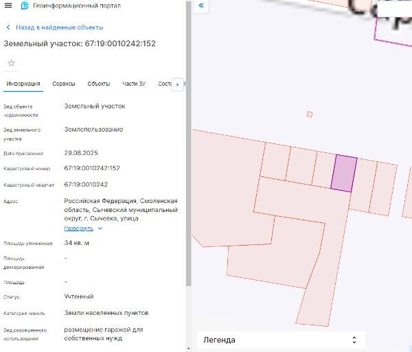 Название: Земельный участок относящийся к категории земель населенных пунктов, расположенный по адресу: Российская Федерация, Смоленская область, Сычевский муниципальный округ, г. Сычевка, улица Алексеевского, западнее 33 метров д.22А, общей площадью 34 (тридцать четыре) кв.м., с кадастровым номером 67:19:0010242:152,с разрешенным использованием: размещение гаражей для собственных нужд; Канал: Госземля Смоленская область Область: обл Смоленская Район: м.о. Сычевский Населенный пункт: г Сычевка, ул Алексеевского Локация: Смотреть на карте ВРИ: Размещение гаражей для собственных нужд Кадастровый номер: 67:19:0010242:152 Кадастровая стоимость: - Вид сделки: Аренда Площадь: 34 м² Начальная цена: - руб. Дата завершения: 04.01.2026 Подробнее: ГИС ТОРГИ #госземля #земляотгосударства #земля #земельныйучасток #земельныеторги #торги #аукцион #арендаземли #аренда #смоленскаяобласть