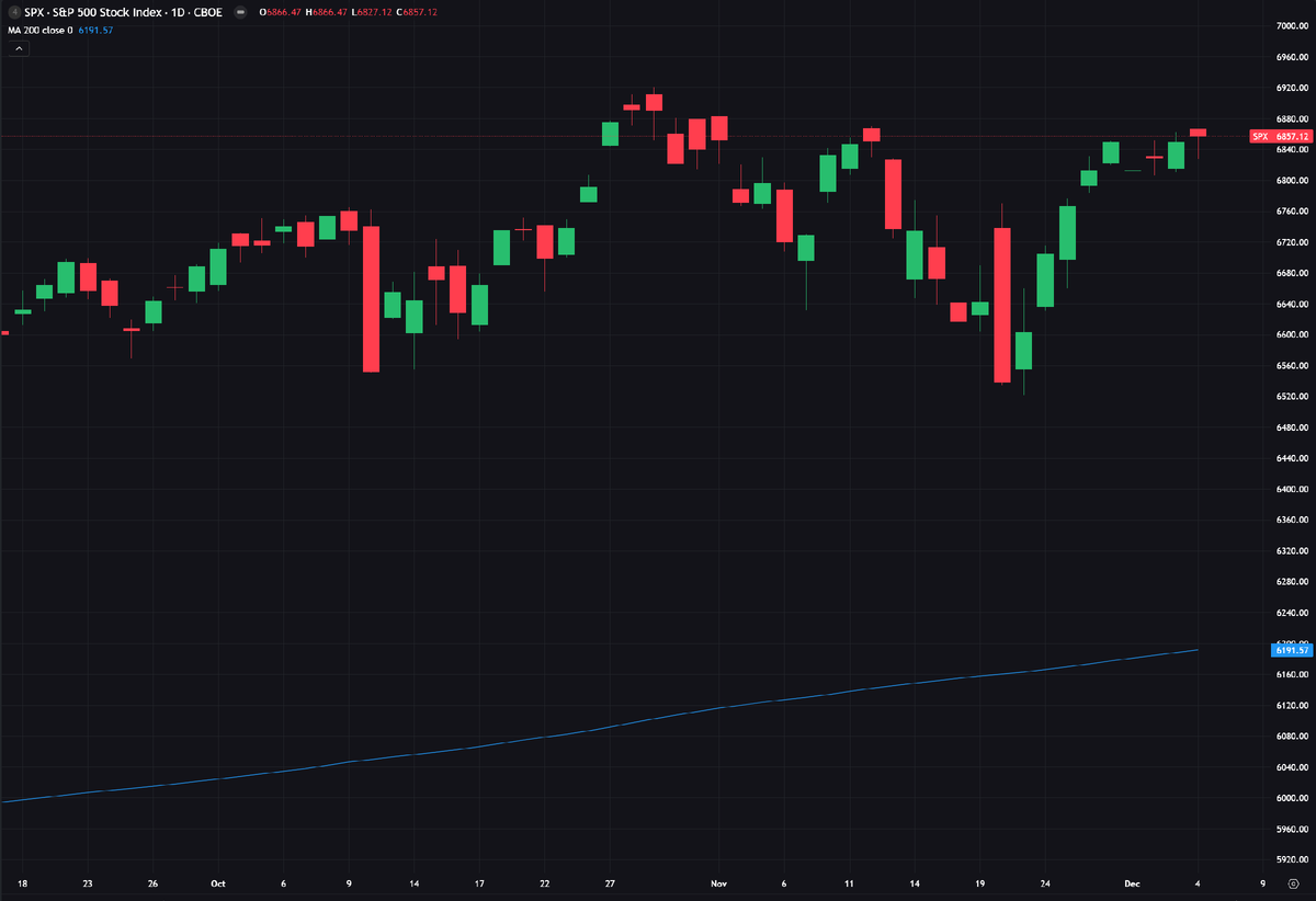 Похоже, что можно выдохнуть, ведь $SPX пережил исключительно мягкое падение поздней осени. От минимума этой коррекции нас отделяет всего 9 дней, а индекс уже находится в непосредственной близости (0,5%) от очередного исторического максимума. Последний максимум закрытия торгов пришелся на 28.10, когда индекс S&P 500 завершил день на отметке 6890,89, а уже к 20.11 индекс потерял 5,1%. Большая часть недавних потерь пришлась на технологический сектор, который сильно отставал от рынка во время этого короткого спада. Nasdaq Composite потерял почти 8%. Я призываю инвесторов пока не быть самоуспокоенными. Слишком много сейчас акций на рынке, которые если и не находятся в пузыре, то уж точно выглядят таковыми. На следующей неделе состоится очередное заседание ФРС, и, похоже, мы получим третье снижение ставки кряду, но в экономике США и на рынке труда явно намечаются трещины. Например, данные Бюро экономического анализа (BEA) показывают, что продажи тяжёлых грузовиков резко упали в октябре и но