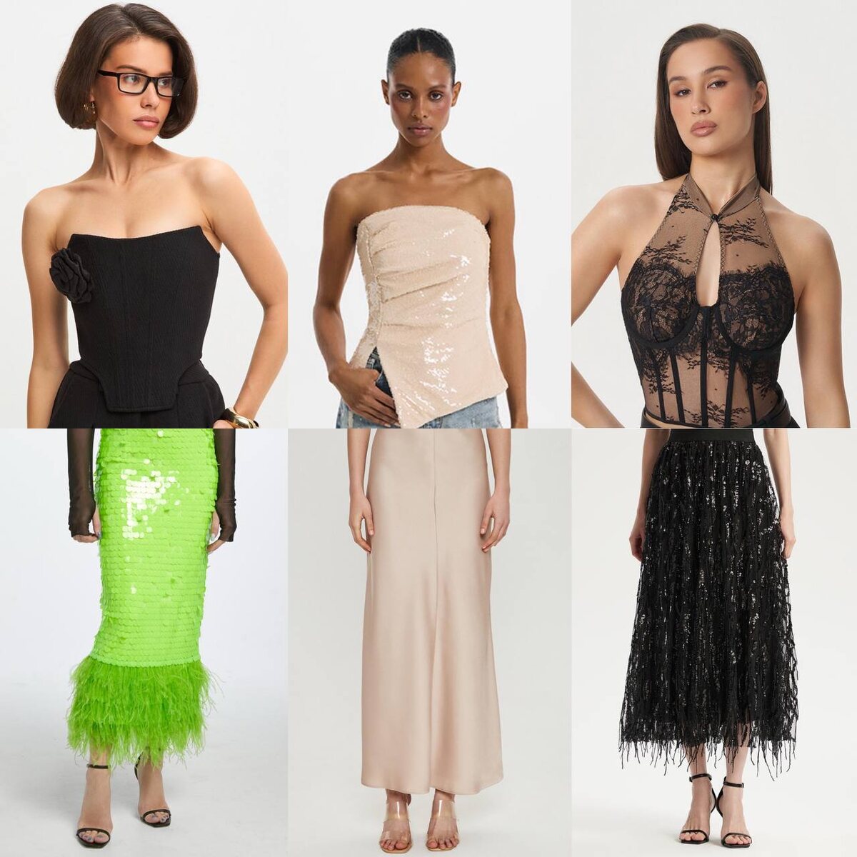 Разнофактурные сочетания для ваших вечерних образов🤩 Чёрный корсет слева 5600 рублей Бежевый топ 5700 рублей Чёрный корсет справа 5900 рублей Зелёная юбка 15600 рублей Бежевая юбка 5800 рублей Чёрная юбка 21800 рублей ✅Мой канал про бюджетный wb здесь #юбки #топы #корсеты #вечерний
