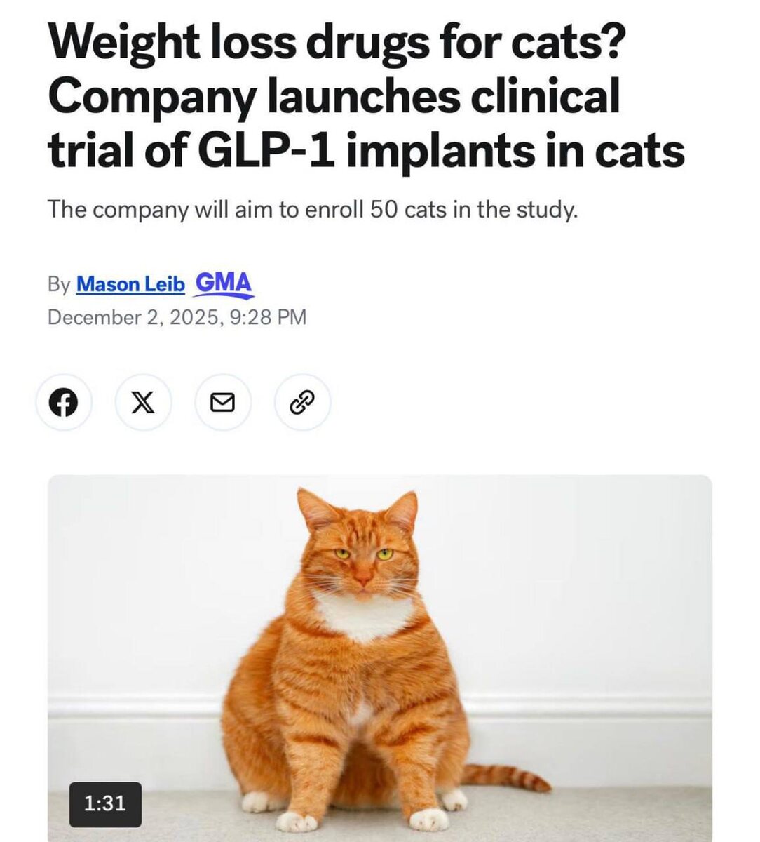 Учёные сделали «Оземпик для котов» — имплант MEOW‑1, который сам худеет вместо животного Под кожу вшивается капсула, которая выделяет гормон GLP‑1 и режет коту аппетит. На выходе: — стабильный уровень глюкозы; — меньше риск диабета; — минус лишний вес и нагрузка на суставы. Идея простая: кот меньше жрёт, больше двигается и живёт дольше, а не задыхается по дороге к миске. Но до реальности ещё далеко: MEOW‑1 только проходит испытания, одобрения ждут не раньше 2027–2028 годов. Вы бы решились вот так «пропатчить» своего кота железкой? #Techtaim