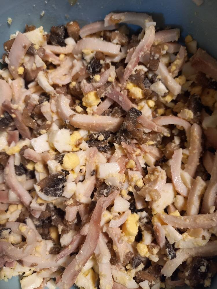 - Все ингредиенты перекладываем в чашку. Заправляем майонезом. Солим по вкусу.