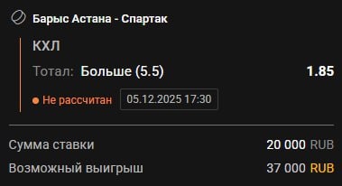 ➕➕➕🏒🏒🏒🏒🏒 🦁Барыс - 🐷Спартак Москва Домашний Барыс это всегда про агрессию, команда старается играть от себя и не отсиживается в обороне, если того не требует ситуация. Но здесь больше отталкиваюсь именно от гостей, у москвичей очевидные проблемы с вратарями, проблемы с защитниками оборонительного плана, зато сумасшедший атакующий потенциал, что команда и демонстрирует в двух крайних матчах (победы 5:4 и 6:7, отыгравшись с 6:3 за 3 минуты до конца матча). Матчи с участием Спартака на выезде являются самыми результативными во всей лиге, сумасшедшие 6.8 шайб в среднем. Сегодня жду игру на встречных курсах с обилием моментов, здесь вопрос только в реализации. Прогноз: Тотал больше 5,5