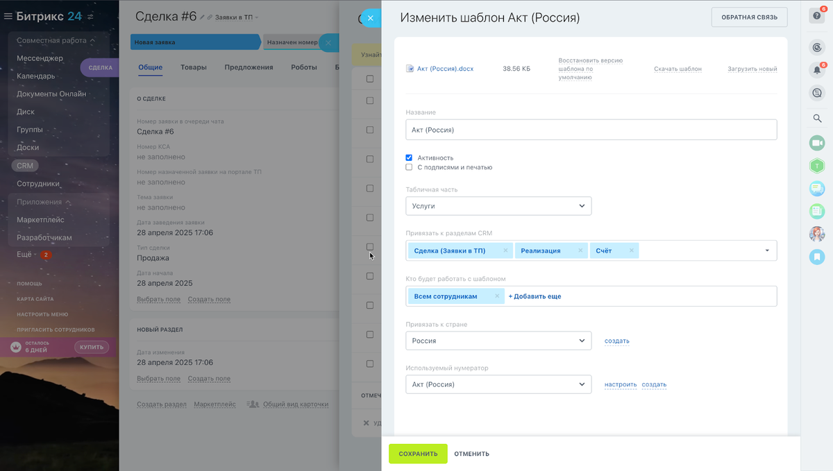 В Битрикс24 есть возможность автоматизировать документооборот на всех этапах работы с клиентами — с помощью готовых шаблонов. Корпоративный портал имеет как стандартные шаблоны CRM, так и функции создания пользовательских форм, которые могут быть интегрированы с лидами, сделками, компаниями и контактами в CRM.