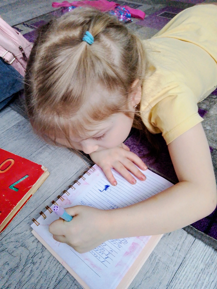 Дочка пользуясь моментом моей безолаберности, попросила с ней в школу поиграть собрала два рюкзака, в одном книги с тетрадями в другой сменную одежду, вот мы по очереди были с ней то учителем то учеником, правда мне как ученику приходилось самой себе задания читать)) а потом оценки обязательно выставляли друг другу )