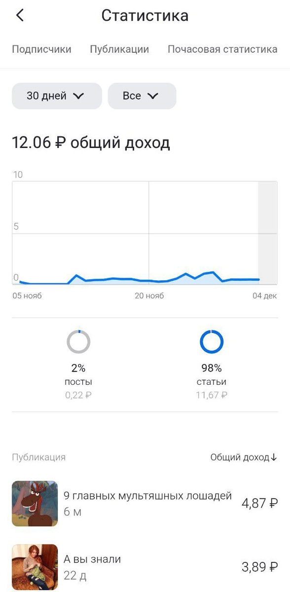 Мои доходы За марафон "Контент-копеечка" , в котором писались посты на ежедневной основе я заработала чуть больше 12 рублей. Но самая вовлекающая публикация, на которой заработана около 5 рублей была написана 6 месяцев назад. Я писала про мой топ лошадей из мультфильмов. Поэтому чисто за марафон заработала около 7 рублей. Поэтому читайте меня чаще. Мне будет приятно