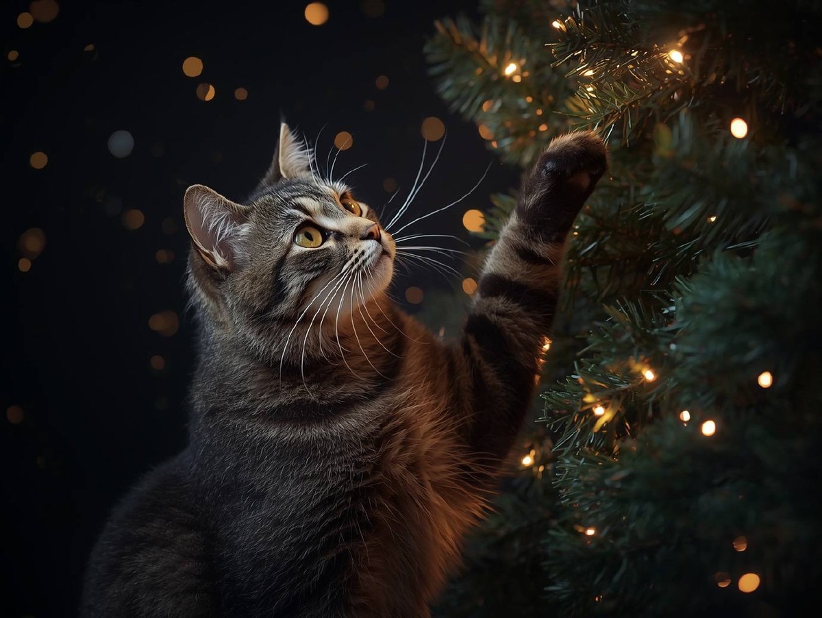 Котик и новогодняя елка с гирляндой - жизненно :-) Промт Create the most realistic image possible, featuring a cat that is exploring a decorated Christmas tree with genuine curiosity. The animal is positioned in the center of the frame and occupies most of it. The cat has extended its paw upwards and is gently touching a branch of the Christmas tree, as if trying to touch or play with the lights of the garland. The cat has a tabby coat with a predominance of dark and light shades of grey. Its eyes are wide open, and its gaze is directed upwards, conveying a sense of curiosity and slight surprise. The whiskers and fur on the paw are clearly visible, adding realism and detail to the image. The Christmas tree is adorned with a garland featuring warm yellow lights that glow softly, creating a cozy, festive atmosphere. The tree branches are dark and dense, with a characteristic coniferous texture.
