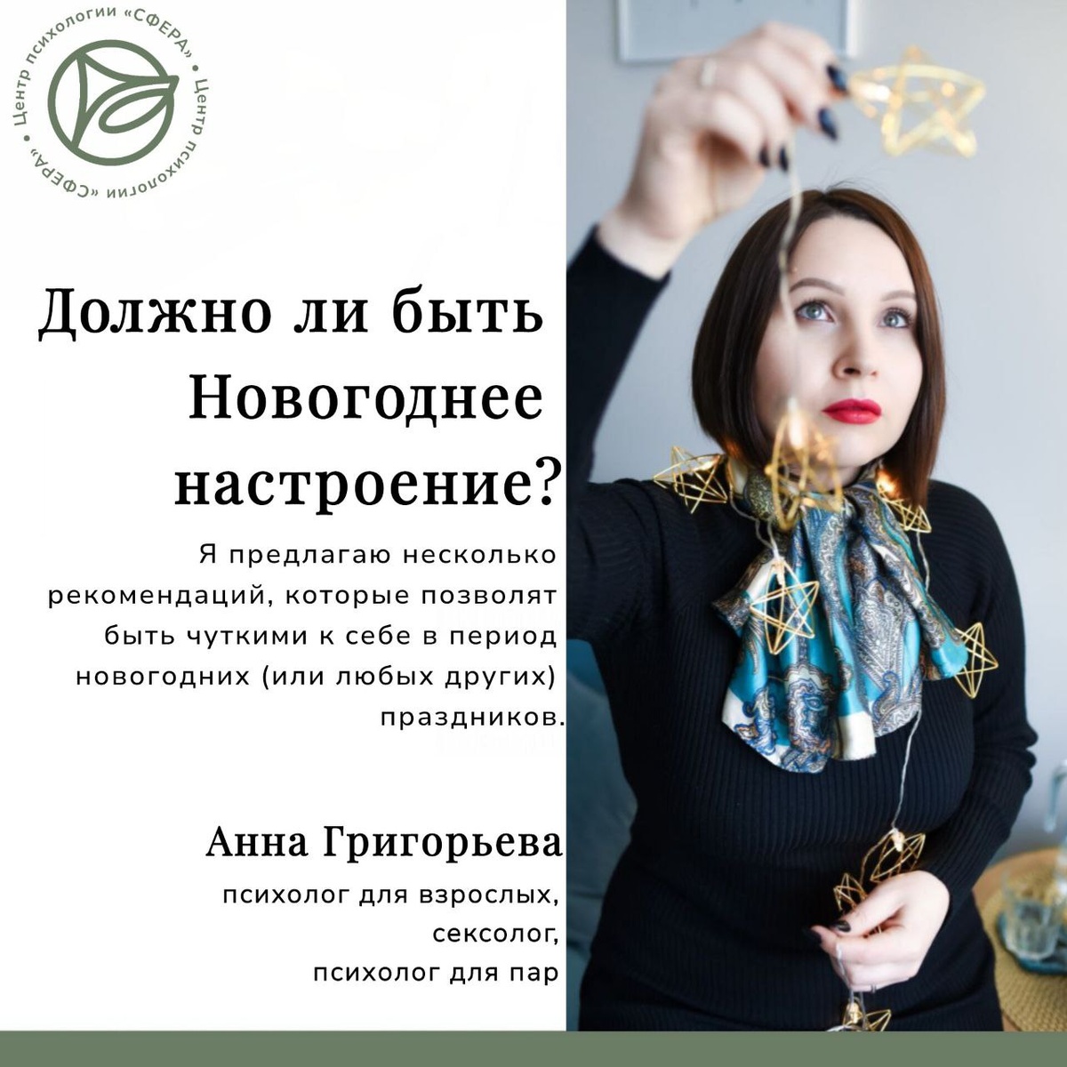 Должно ли быть Новогоднее настроение? Перед Новогодними праздниками, часто поднимаются темы от клиентов: Как поднять новогоднее настроение? Чем ближе праздник, чем тяжелее эмоционально… Я начинаю чувствовать себя одиноко, раздражаться или испытывать вину, что не могу радоваться как «все нормальные люди». Общество, маркетинг и соцсети создали образ «идеального праздника»: безупречный ужин, счастливая семья, дорогие подарки, все сияют от радости, как в рекламе майонеза. Но становится всё более очевидно, что реальность не соответствует этому глянцевому шаблону. Более того, среди всего этого блеска мишуры, продолжается обычная жизнь. Кто-то разводится, кто-то болеет, кто-то проживает горе, кто-то невероятно устал - это можно продолжать до бесконечности. И вот, в место праздничного настроения, возникает: · Раздражение при виде украшений, новогодней рекламы и «чрезмерно веселых» людей. · Апатия, отсутствие сил и желания заниматься подготовкой, даже если раньше это нравилось. · Мысли
