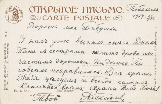 Твой Алексей Цесаревич Алексей Николаевич – бабушке императрице Марии Фёдоровне. Тобольск, 5 ноября 1917 г. Hoover Institution Library & Archives Автограф письма цесаревича Матери в 1914 году... Интересна форма конверта с личной печатью Алексея Николаевича., его знаком, монограммой... Гусар и Улан - сестры Ольга и Татьяна..
