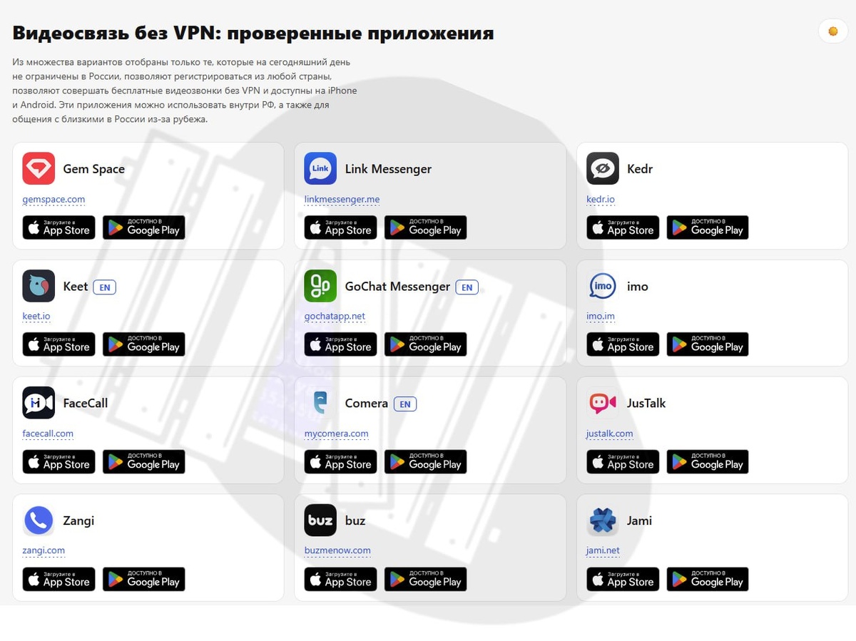 ⚡️ Готовимся к цифровому апокалипсису Ну что, дожили. Они похоже решили, что FaceTime и Google Meet слишком хороши для простых смертных, а звонки в Телеграме иногда заикаются так, будто пытаются передать привет из 90-х через модем. Чтобы вы не остались без связи с бабушкой или коллегами (хотя второе, может, и к лучшему), я раскопал список выживших. Это приложения, о которых вы, скорее всего, не вспоминали бы в сытые времена. Но сейчас не до жиру. Они работают без VPN, пока не забанены и даже передают видео. Качаем, пока и этот список не превратился в тыкву: Для тех, кто любит экзотику: - Gem Space — [Android]| [iOS] - Keet — [Android] | [iOS] - Buz — [Android] | [iOS] Старая гвардия и их клоны: - imo (да, он жив!) — [Android] | [iOS] - JusTalk — [Android] | [iOS] - Zangi — [Android] | [iOS] Для параноиков и любителей децентрализации: - Jami — [Android] | [iOS] И еще пачка вариантов на черный день: - FaceCall — [Android] | [iOS] - Link Messenger — [Android] | [iOS] - G