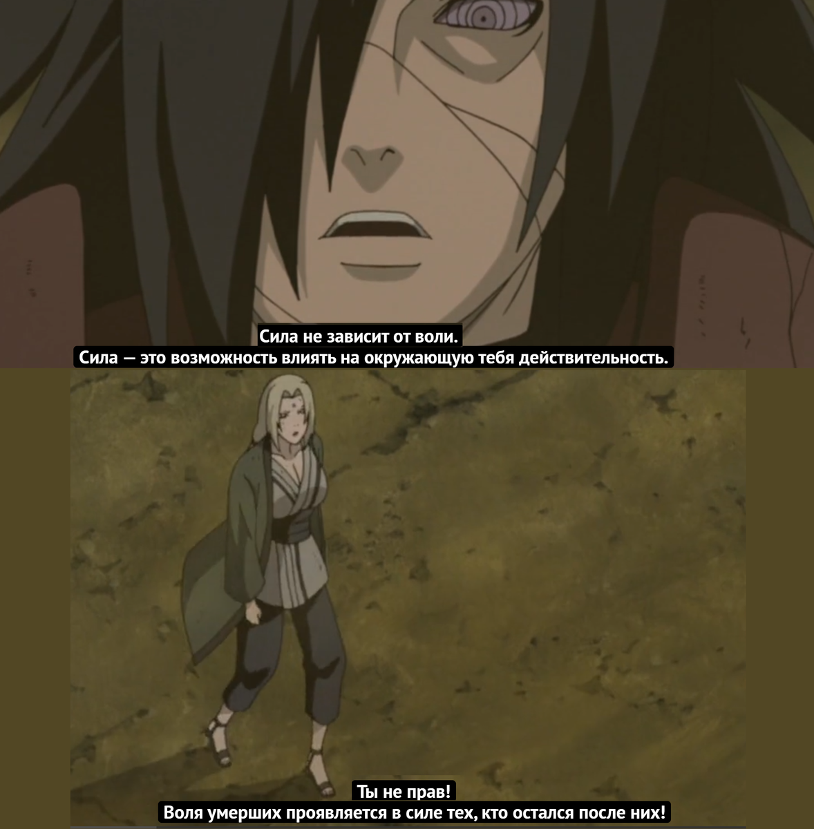 Мадара задвигает философскую вещь, мол ВОЛЯ ничего не стоит, и лишь только СИЛА даёт нам возможность влиять на окружающую действительность, но Цунаде заявляет, что воля умерших ПРОЯВЛЯЕТСЯ В СИЛЕ новых поколений.