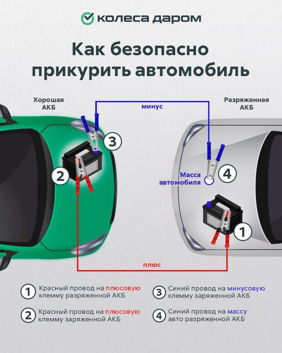 Как правильно «прикурить» автомобиль зимой 🔋 Классика зимнего утра: нужно срочно ехать, а машина не заводится 😓 Аккумулятор сел. Можно «прикурить» от другого авто, но делать это нужно правильно — иначе рискуете спалить электронику. Главное, что нужно знать: не все машины можно «прикуривать» (проверьте инструкцию), напряжение обоих аккумуляторов должно совпадать (обычно 12В), и провода подключаются строго в определённой последовательности — сначала плюс, потом минус на массу. Ещё важно: если после 3-4 попыток машина не завелась, проблема не в аккумуляторе. Не мучайте донора — вызывайте эвакуатор. В статье — подробная инструкция, какие провода выбрать, как попросить помощи на дороге и что делать, если «прикуривание» не помогло. 🥺 Пусковые провода в багажнике — как запаска: пока не понадобятся, не ценишь