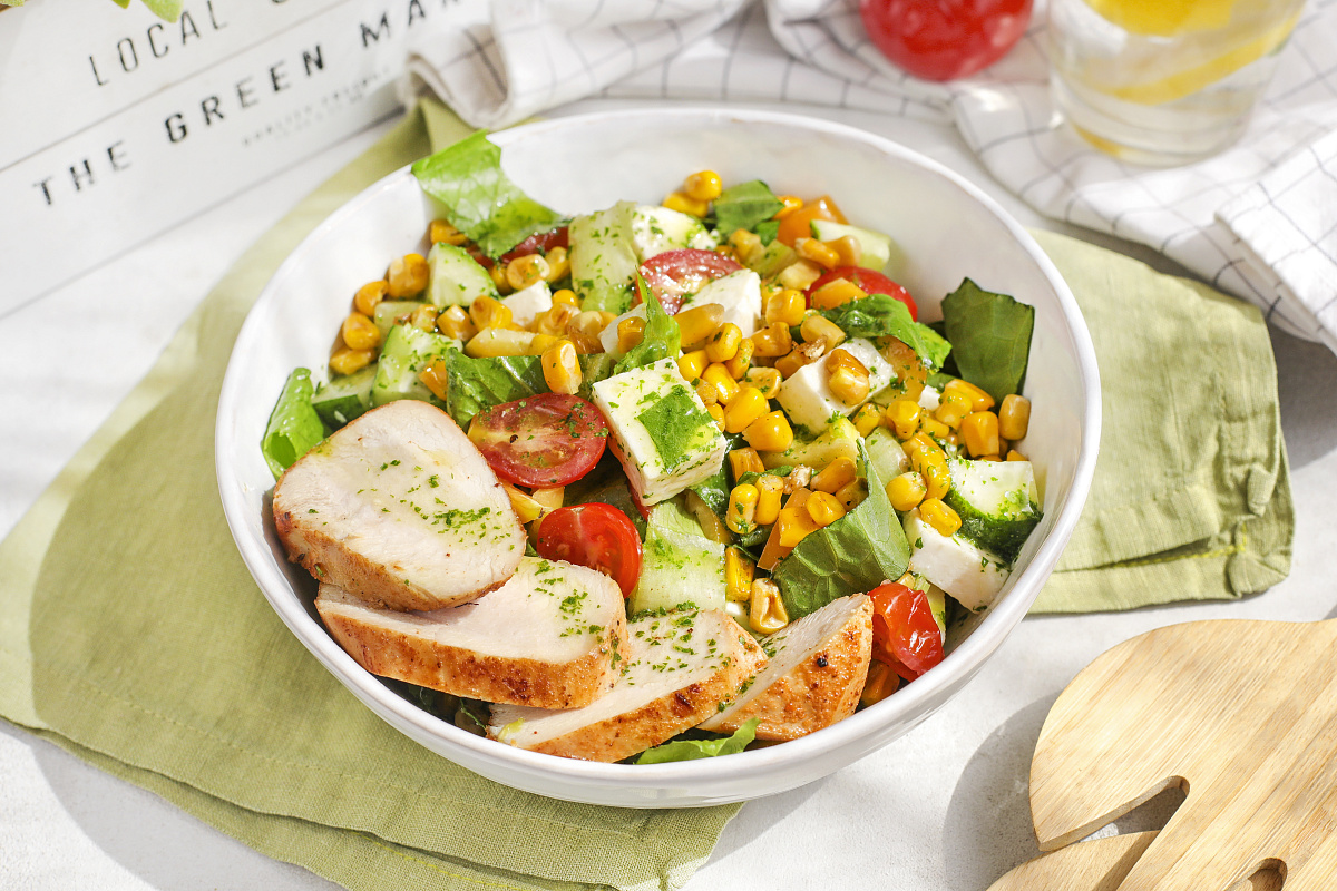 📝 Ингредиенты: (2 порции) - салат романо 100 гр. - огурцы 1-2 шт. - помидоры черри 120 гр. - кукуруза заморож 100 гр. - перец 1 шт. - молодой адыгейский сыр 100 гр. - филе куриное (цельное) 300 гр. - каджунские специи 2 ч.л. - кинза 2-3 вет. - лимон 0.5 шт. - тмин 0.5 ч.л. - мед 20 гр. - оливковое масло 40 мл. 🔥 Приготовление: 1. Обваляйте куриное филе в каджунской приправе со всех сторон, используя её по вкусу, так как она острая. 2. Оставьте на 5 минут. 3. Разогрейте сковороду с маслом и обжарьте курицу по 4-5 минут с каждой стороны на среднем огне. 4. Снимите с огня и дайте мясу постоять под крышкой 5-6 минут. 5. Затем охладите и нарежьте ломтиками. 6. Для заправки смешайте в блендере мёд, кинзу, оливковое масло и тмин. 7. Добавьте лимонный сок по вкусу и взбейте до однородности. 8. Обжарьте кукурузу на сковороде с маслом 2-3 минуты на среднем огне. 9. Нарежьте сыр кубиками. 10. Удалите семена из перца. 11. Произвольно нарежьте огурцы и перец. 12. Помидоры черри разрежьте п