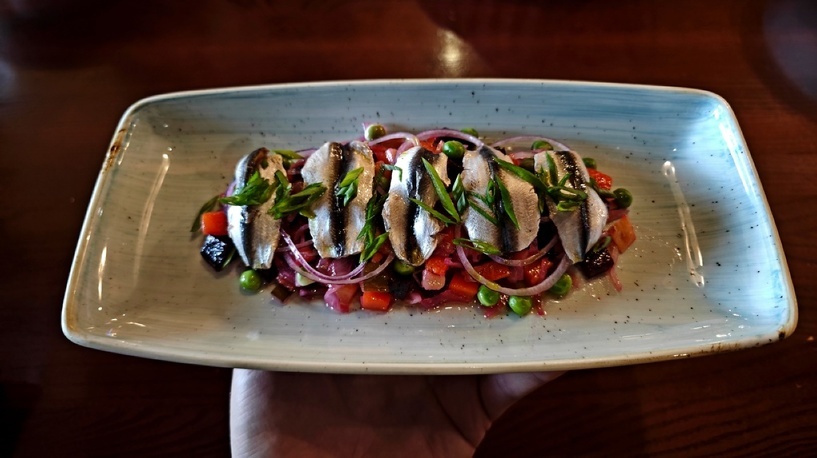Килечные филешки добавляют солоноватости и сочности, сама овощная основа бодра и по-советски канонична, луковые колечки тонкого реза добавляют остринки и изящества.