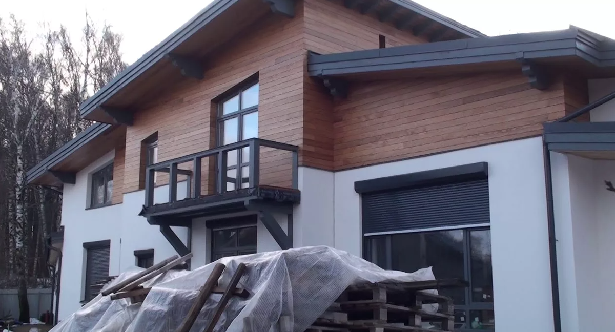 Такой фасад выглядит благородно и дорого, но требует дисциплины от владельца. Натуральное дерево необходимо обрабатывать защитными маслами или пропитками каждые 3–5 лет, иначе под воздействием ультрафиолета и влаги оно посереет и потеряет вид.