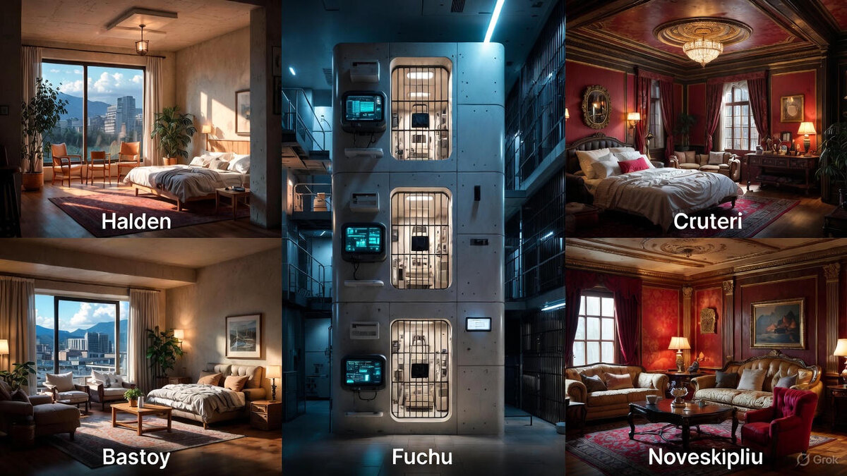 Условия: Капсульные камеры 2x1 м, татами, минимализм. День по расписанию: 6:00 подъём, работа (шитьё, сборка), 21:00 отбой. Нет ТВ, но есть чтение. Женщины в отдельных блоках. Фокус на дисциплине и труде.