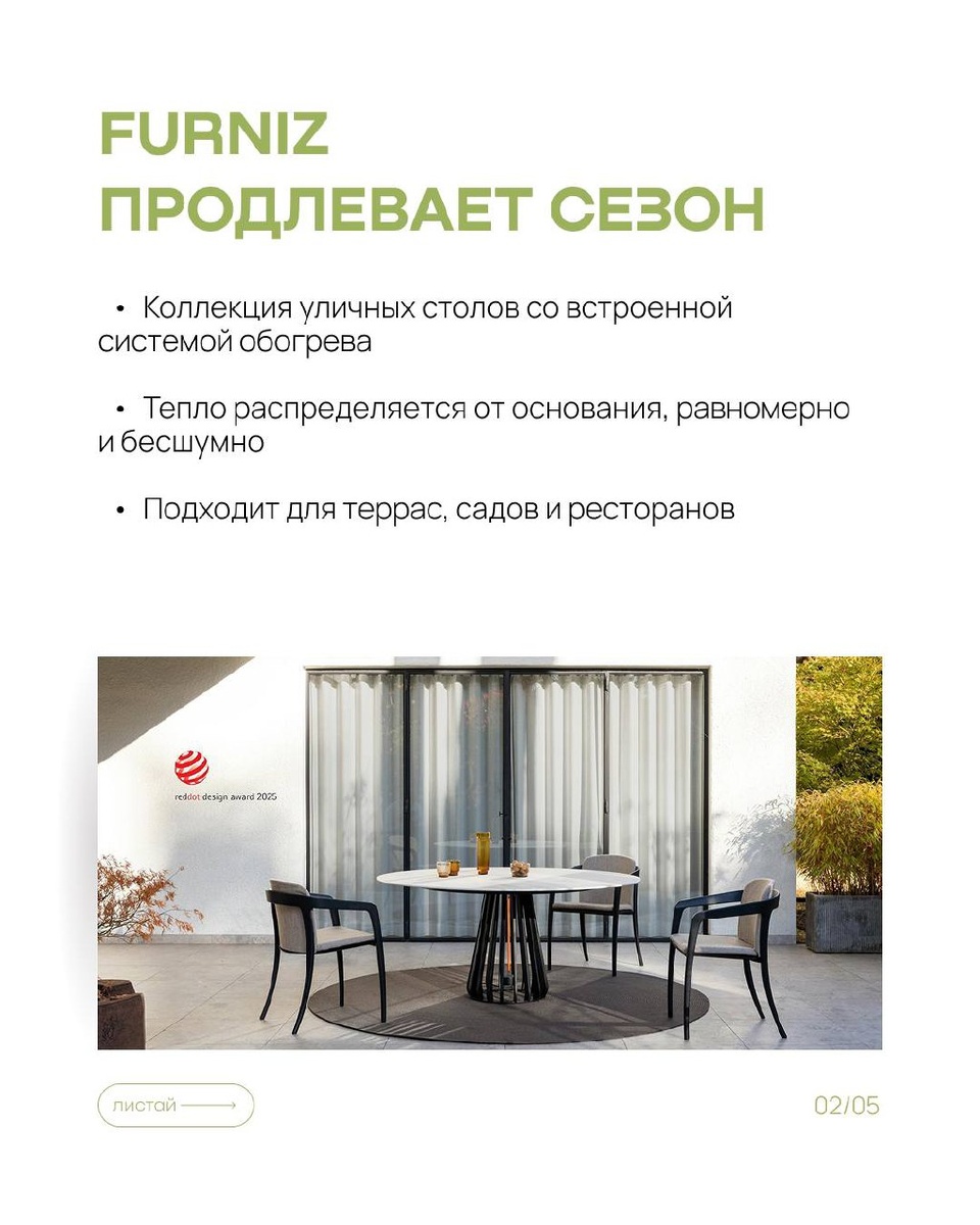 переосмысливает уличный комфорт и показывает, как outdoor может быть технологичным и одновременно эстетичным. Встроенная система обогрева делает использование стола продуманным в любое время года. База работает как архитектурный элемент и создаёт выразительный объём в пространстве.