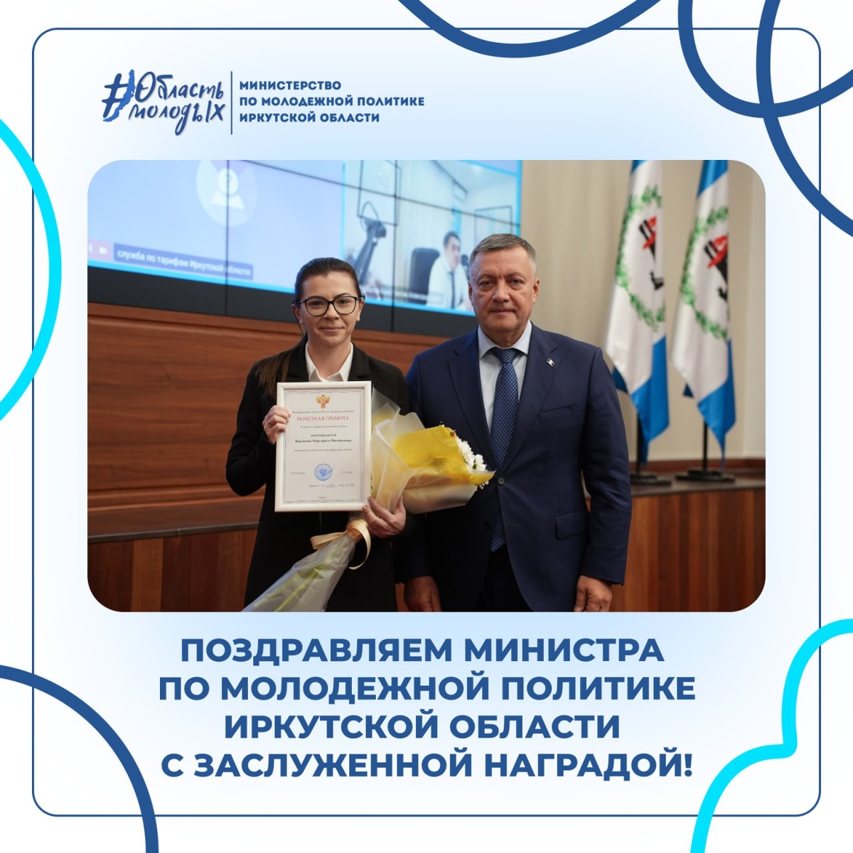 🩵 Работа с молодежью Приангарья получила федеральное признание! ✨ Министру по молодежной политике Иркутской области Маргарите Цыгановой вручена Почетная грамота Федерального агентства по делам молодежи. Эта высокая оценка труда является признанием значительных достижений в сфере молодежной политики на территории региона. За последние годы отмечена устойчивая положительная динамика. ⏩ В рамках реализации национального проекта «Дети и молодежь» Министерством по молодежной политике Иркутской области и подведомственными учреждениями организовано и проведено свыше 1500 мероприятий для граждан в возрасте от 14 до 35 лет. Общее количество участников составило порядка 300 тысяч человек, а в муниципальных образованиях успешно функционируют 12 молодежных центров. ⏩ Также за пятилетний период существенно расширились возможности для самореализации молодежи благодаря флагманским областным проектам. Знаковым событием стало учреждение Премии Губернатора Иркутской области в сфере молодежной полити