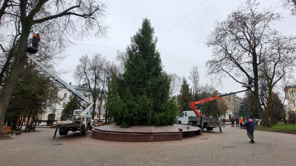 Зелёная 12-метровая красавица появилась в сквере Карла Маркса. Сегодня её начали украшать. В Брянске свершилось долгожданное предновогоднее событие – в сквере Карла Маркса поставили главную городскую ёлку. Об этом сегодня сообщает корреспондент «БГ». Пушистую 12-метровую красавицу, напомним, подарила городу жительница посёлка Большое Полпино. Во дворе её дома дерево росло более 35 лет. Сегодня ёлочка засияет: над установкой гирлянд трудятся электрики дорожного управления. На месте работают две автовышки. – Работа идёт бодро, под современные новогодние песни! – передаёт наш корреспондент. Разноцветными светящимися огоньками ёлку обернут в несколько рядов. Также гирлянды развесят по всему периметру вокруг главного символа праздника. Венчает ель наконечник в виде звезды, который также будет гореть в темноте. В ближайшее время на пушистых лапах ели появятся игрушки. Водить хороводы горожане могут также вокруг двух других новогодних ёлок – правда, искусственных. Они появились на Кургане Бес