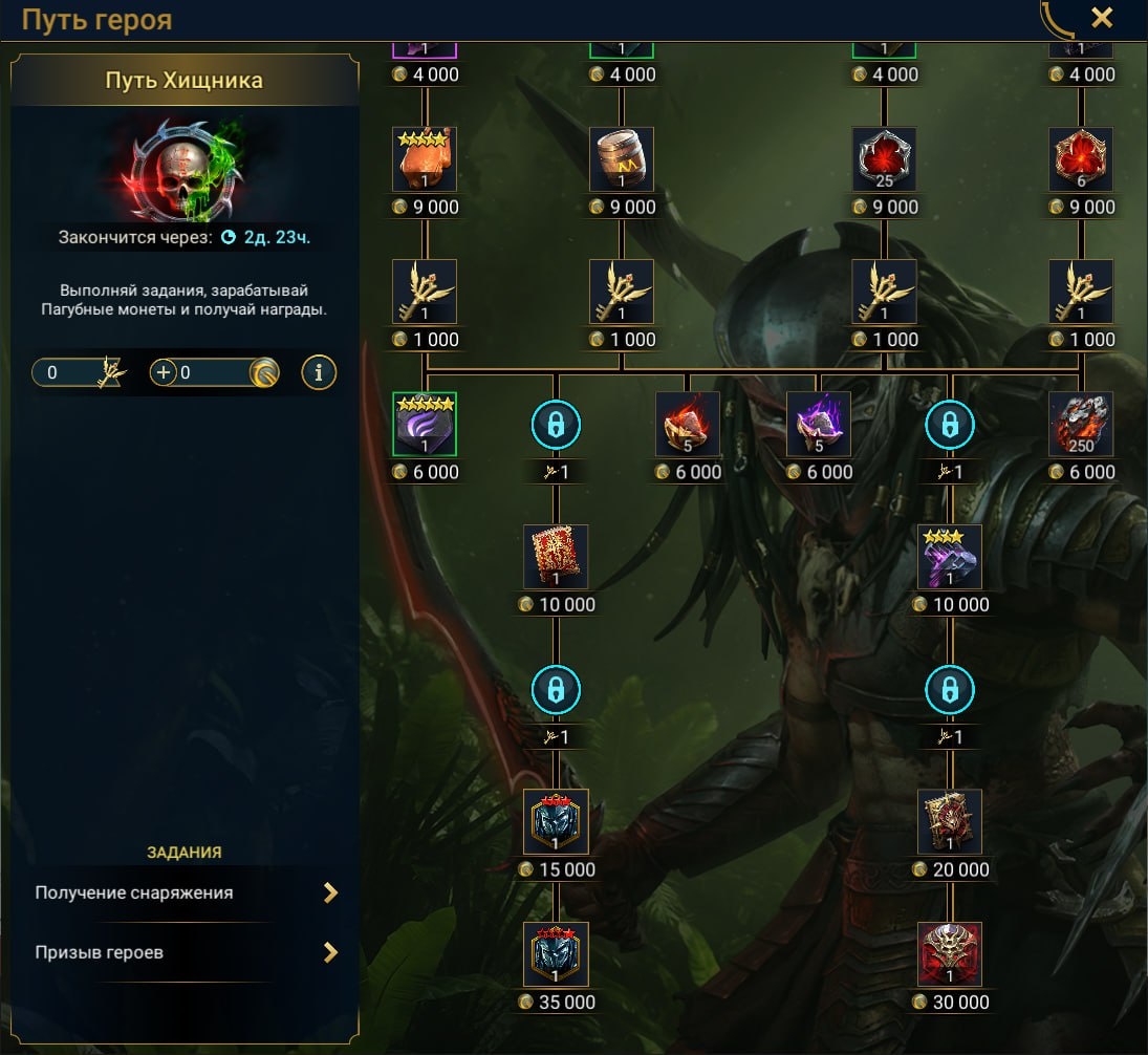 Запустили событие «Путь Хищника» Очки начисляются за: - Призыв героев - Получение снаряжения
