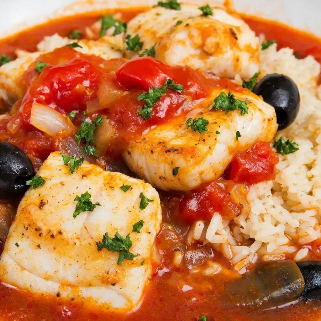 5. Приправить по вкусу и подавать, выложив на рис, украсить петрушкой и оливками.