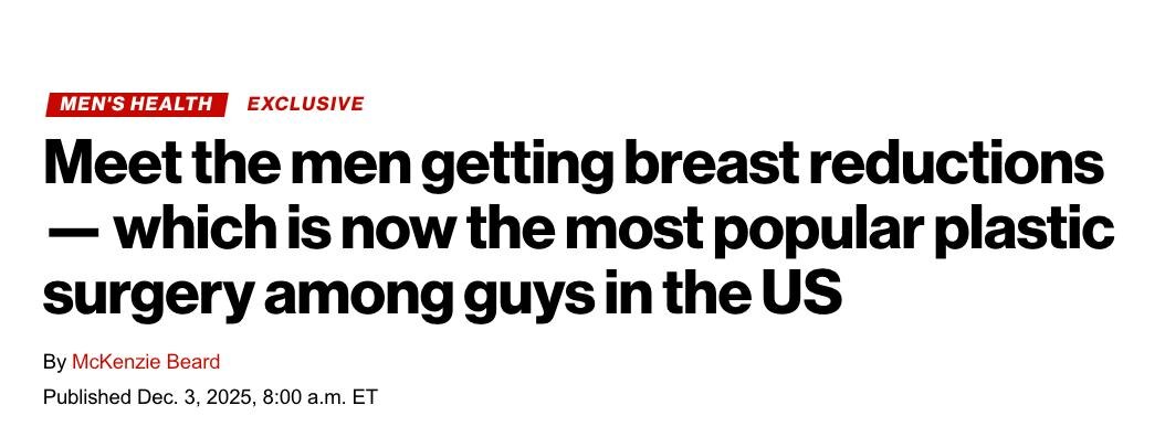 Кричим: оказывается, в США сейчас самая популярная операция среди мужчин — это уменьшение груди. И не среди тех, кто идентифицирует себя с другим полом, а среди обычных мужчин. За прошлый год хирурги сделали более 26 000 операций по уменьшению груди мужчинам. Гинекомастия — достаточно распространённое заболевание. У кого-то из-за проблем с гормонами, кто-то резко похудел, а у кого-то — из-за употребления наркотиков, алкоголя и некоторых лекарств. Следите за своим здоровьем, мужики! @lobushkin