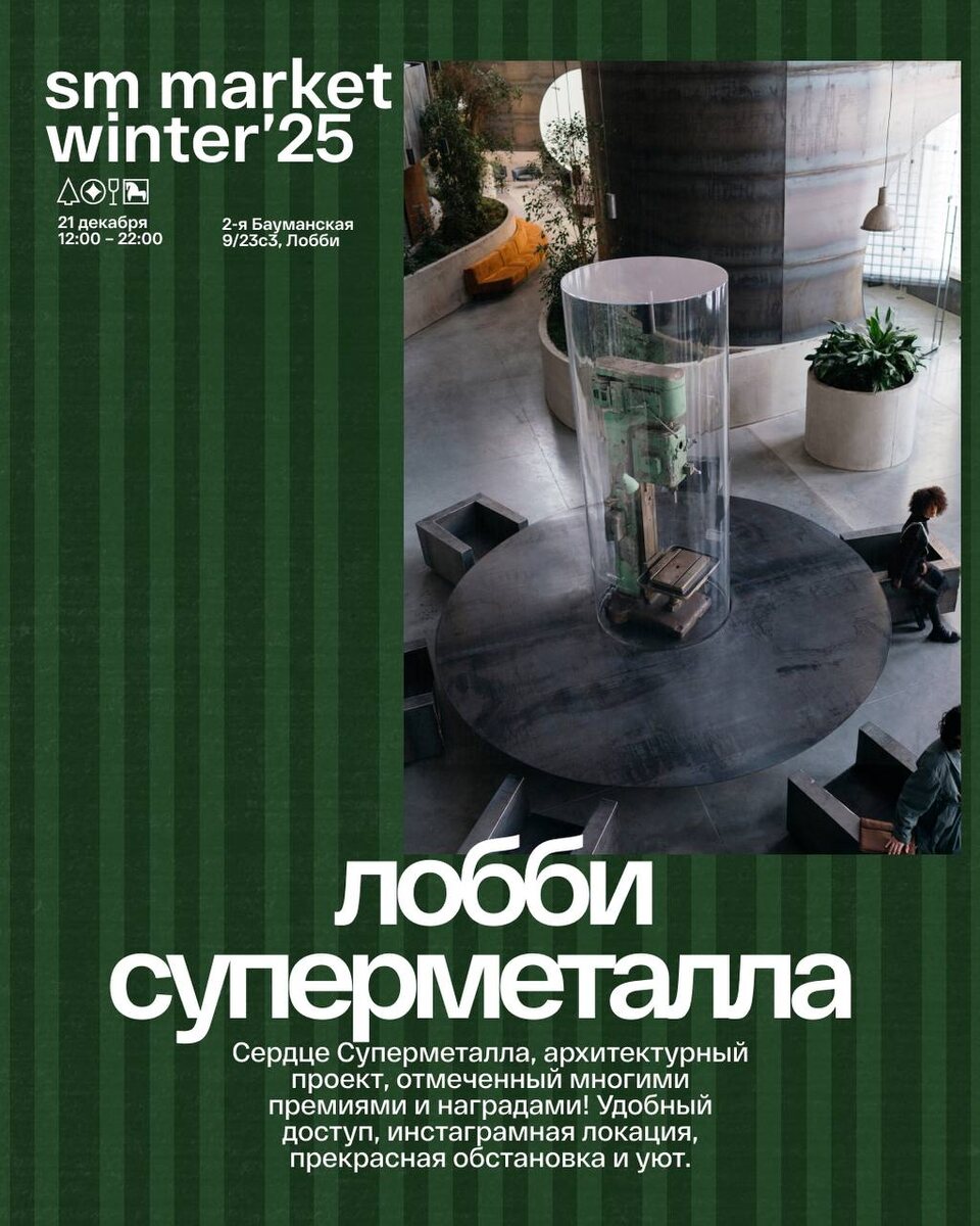 Зимний маркет пройдет в Лобби Суперметалла. Сердце нашего пространства, архитектурный проект, отмеченный многими премиями и наградами! Здесь проходили модный показ Александра Арутюнова, съемки ЦУМ, LIME и многих других брендов, выставки Fresh Glass, Даниила Кудряшова, презентации журнала Правила Жизни, а также съемки выпусков интервью Ксении Собчак. Ждем вас на маркете 21 декабря и продолжаем принимать заявки от брендов и художников. стать участником маркета: marketsupermetall@gmail.com стать партнером: smm@supermetall.com