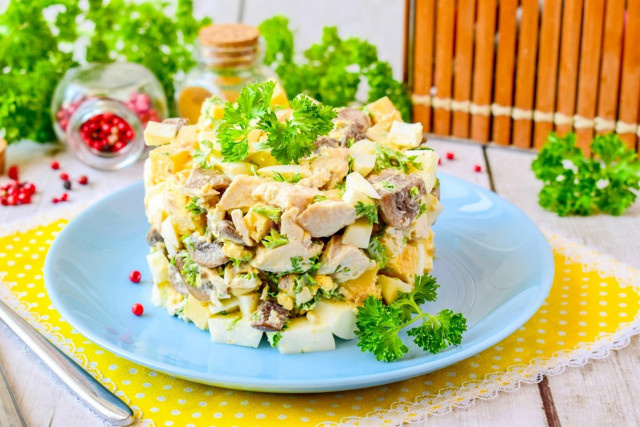 Если вы ищете лёгкий, ароматный и при этом очень праздничный салат, то этот рецепт — ваш идеальный выбор 🎉 Салат «Нежность» — это баланс нежной курочки, душистых грибов, хрустящих огурчиков и воздушных яично-сырных слоёв. Он отлично подойдёт и для Нового года, и для семейного ужина — а готовится всего за 20 минут ⏱️ 🛒 Ингредиенты (на 4 порции): Куриное филе отварное — 300 г 🍗 Шампиньоны свежие — 250 г 🍄 Лук репчатый — 1 шт. 🧅 Огурцы солёные — 3 шт. 🥒 Яйца — 4 шт. 🥚 Сыр твёрдый — 150 г 🧀 Майонез — 3–4 ст. л. (лучше лёгкий) 🥄 Сливочное масло — для жарки грибов 🧈 Укроп или петрушка — для украшения 🌿 👩🍳 Как приготовить: 1. Подготавливаем продукты Куриное филе отварите заранее, остудите и разберите на тонкие волокна — так салат будет особенно нежным. Яйца сварите вкрутую, остудите и очистите. Белки натрите на мелкой тёрке, желтки — отложите на самый верхний слой. 🥚 Сыр натрите на мелкой тёрке. 🧀 Огурцы нарежьте мелким кубиком. 🥒 Лук мелко порубите, шампиньо