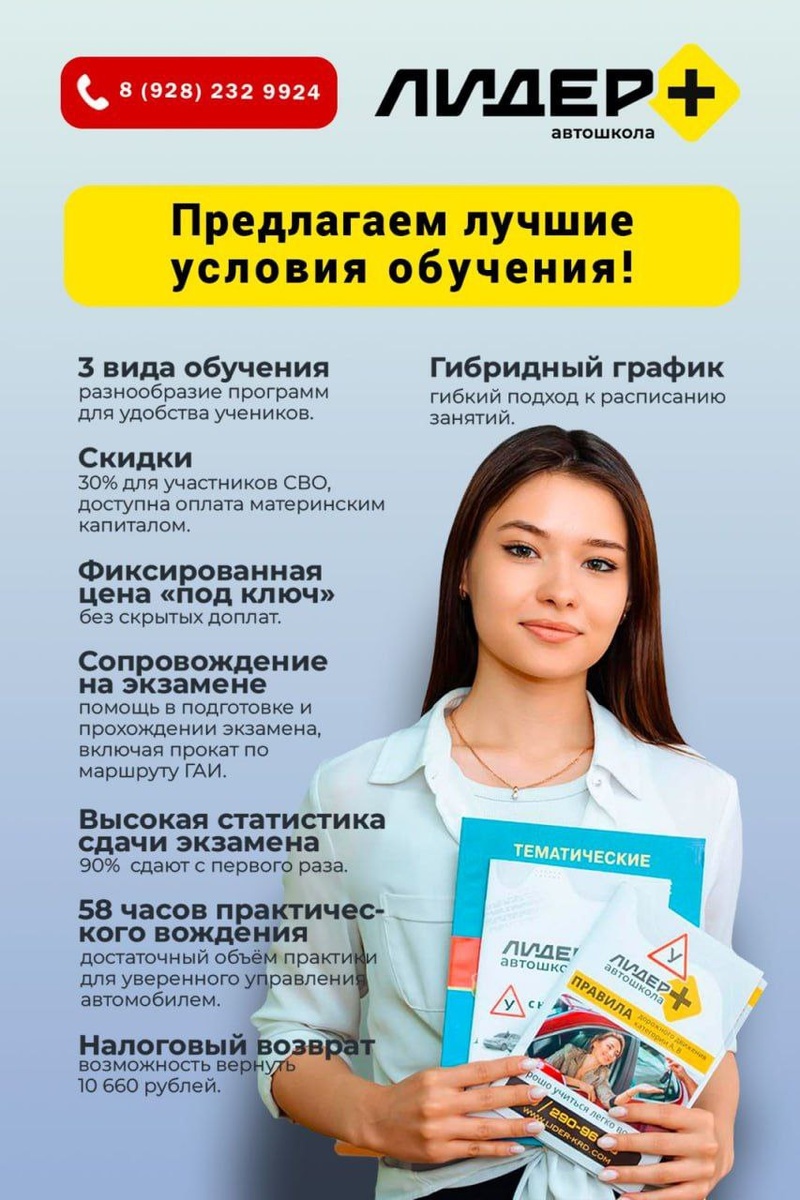 🚗 Автошкола «Лидер+» | Краснодар Сдать на права с первого раза? — Да, это реально! 96% наших учеников делают это благодаря нашей системе. Почему выбирают нас? Вот главные причины: ✔️ САМАЯ БОЛЬШАЯ ПРАКТИКА в городе — 58 часов вождения! ✔️ Теория: онлайн, очно или гибрид — как вам удобно. ✔️ Новый автопарк (МКПП и АКПП). ✔️ Бесплатная пересдача внутреннего экзамена. ✔️ Прокат по реальному маршруту ГИБДД перед экзаменом. ✔️ Наш менеджер и инструктор сопровождают вас прямо до получения прав! ✨ Специальные условия: ▪️ Льготы для семей участников СВО ▪️ Оплата материнским капиталом ▪️ Индивидуальная скидка при записи! ❗️ ВНИМАНИЕ: Успейте записаться по старым ценам! Стань уверенным водителем с «Лидер+»! 👉 Рассчитаем вашу персональную скидку за 5 минут! Свяжитесь с нами удобным способом: 📱 WhatsApp: wa.me/79282714742 📞 Телефон: +7(861)290-96-96 🌐 Сайт: lider-krd.com 🕘 Работаем ежедневно: 9:00 – 20:00 📍 9 филиалов по всему Краснодару: 1. ул. Ставропольская, 159 2. ул. Красная