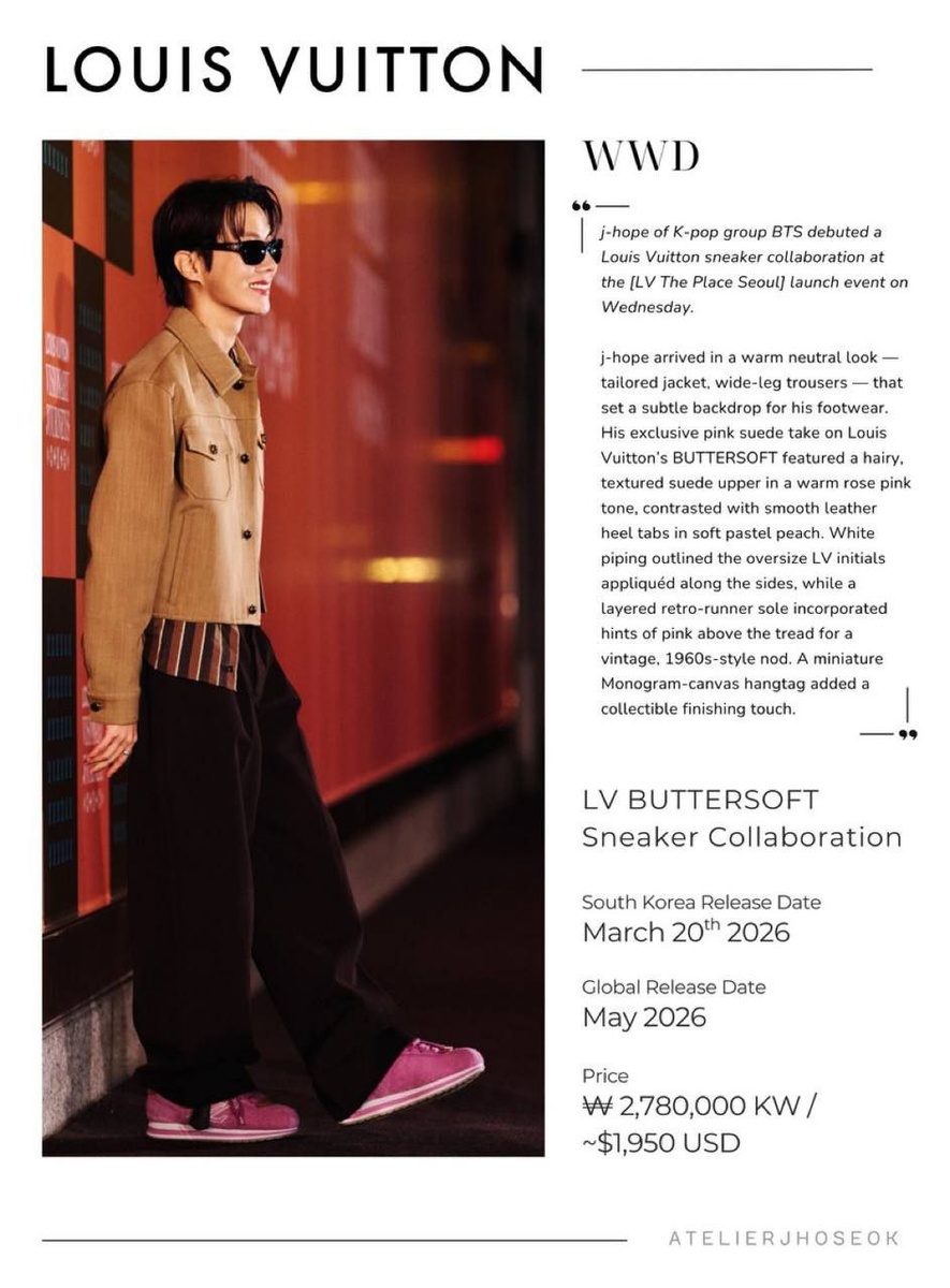 🍒 По данным WWD, Джей-Хоуп представил коллаборацию кроссовок с Louis Vuitton на мероприятии в среду. "Я лично посетил выставку Visionary Journeys в Осаке, поэтому уже хорошо понимал её концепцию — и увидеть, как она воплощена здесь, в Сеуле, в таком значимом пространстве, действительно что-то особенное", — рассказал Джей-Хоуп изданию WWD. "Когда я впервые вошёл, масштаб был таким грандиозным и впечатляющим — каждое пространство ощущалось наполненным смыслом. Особенно мне запомнилась Музыкальная комната. Использование мятных оттенков — цветовой палитры, к которой я естественно тяготею — произвело сильное визуальное впечатление, а интеграция музыки в пространство сделала его ещё более значимым", — добавил он. Джей-Хоуп появился в тёплом нейтральном образе — приталенный жакет, брюки широкого кроя — которые служили спокойным фоном для его обуви. Его эксклюзивная интерпретация модели Buttersoft от Louis Vuitton в розовой замше отличалась ворсистой, текстурированной замшей тёплого розово