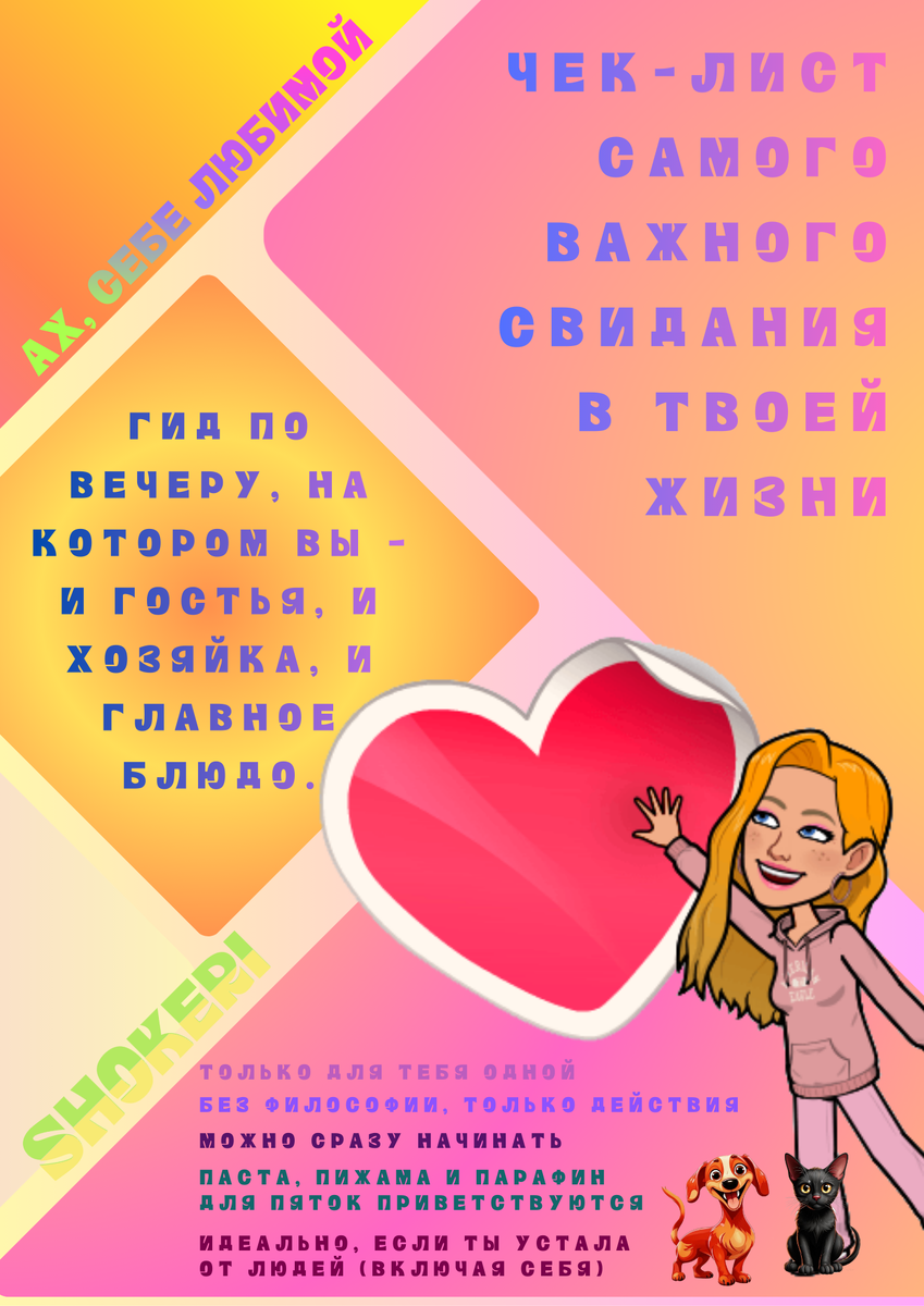 Знакомо чувство, когда смотришь в зеркало и думаете: «Я бы на свидание с такой точно не пошла»? Стоп. 👋 Хватит это терпеть. Пора назначить главное свидание года. Там будет все: атмосфера, ритуалы, вкусная еда и тот самый гость, ради которого все затевалось — вы сами. Представляем наш новый цифровой гайд от shokeri.life: «АХ, СЕБЕ ЛЮБИМОЙ: Чек-лист самого важного свидания в твоей жизни» Это не про скрабы и маски. Это про полноценный романтический вечер с собой. Без философии, с чёткими шагами, каракулями и настроением, как будто его составила твоя самая крутая подруга. Что внутри? ✅ Готовая программа-ритуал: от блокировки мира до момента, когда ты гасишь свет. ✅ Атмосферные лайфхаки (например, как за 2 секунды наполнить комнату волшебным запахом). ✅ Практики, чтобы наконец почувствовать свое тело, а не критиковать его. ✅ Идеи для ментальной разрядки — от писем любви до сольного танцевального флэшмоба. ✅ Дизайн в фирменной нежной и чуть детской стилистике shokeri, который сам по себе —